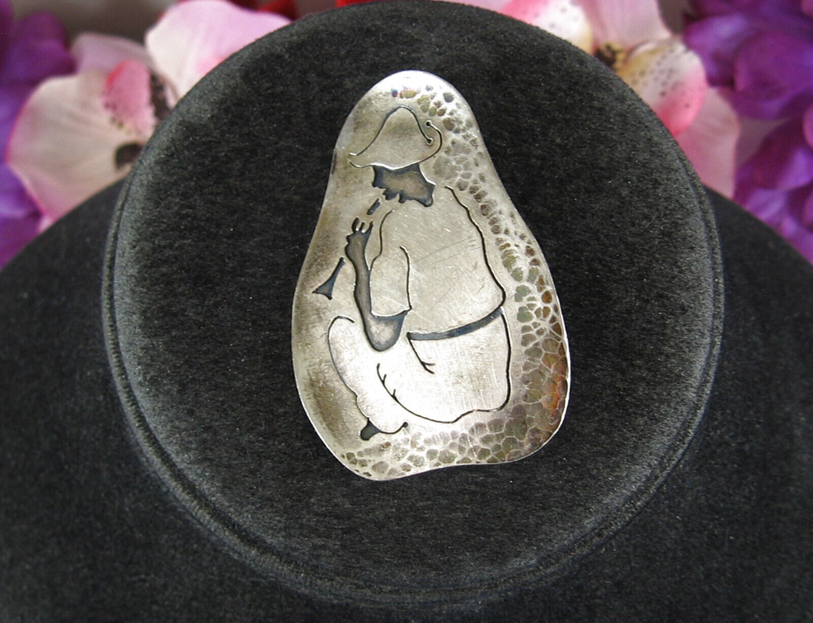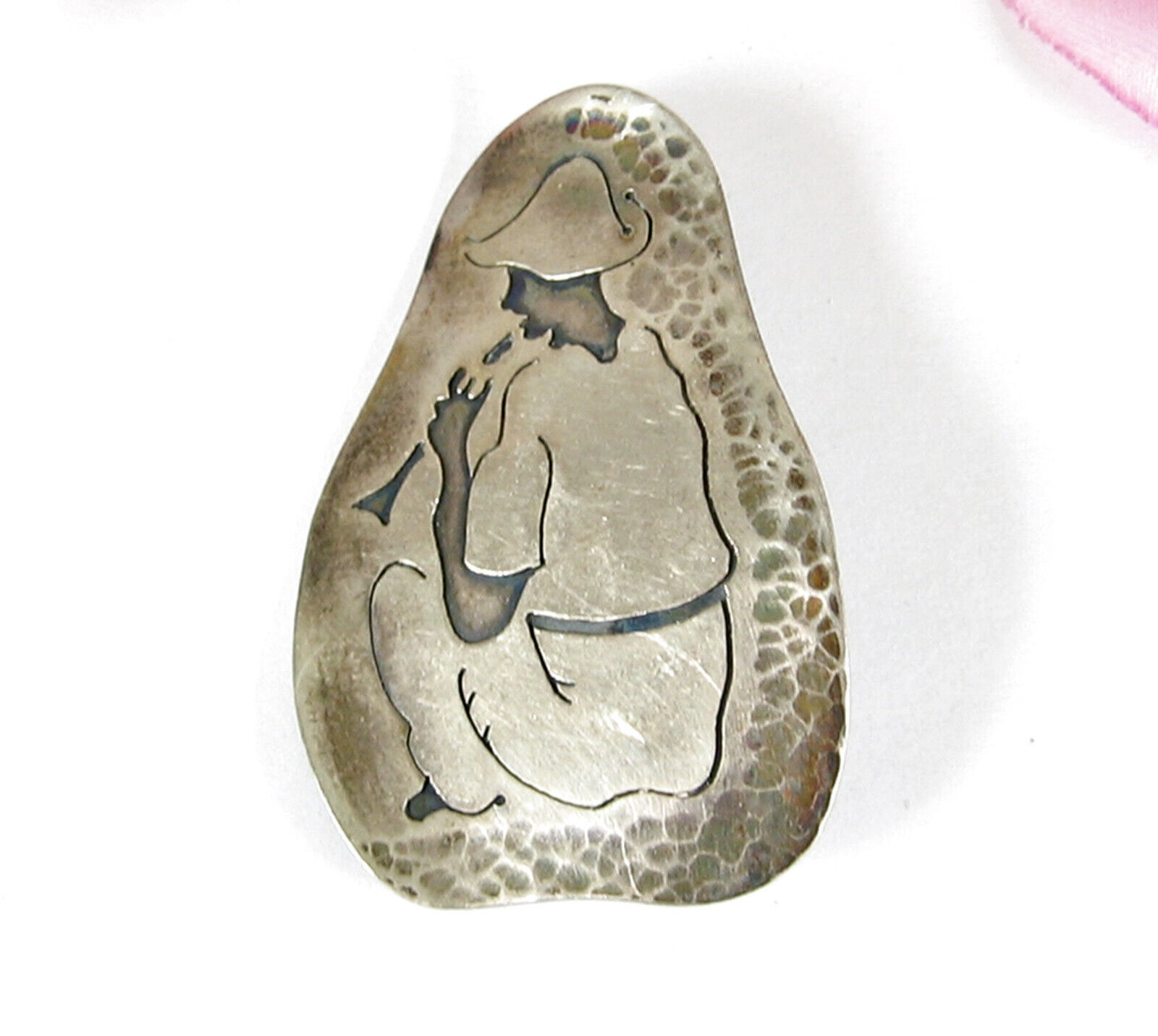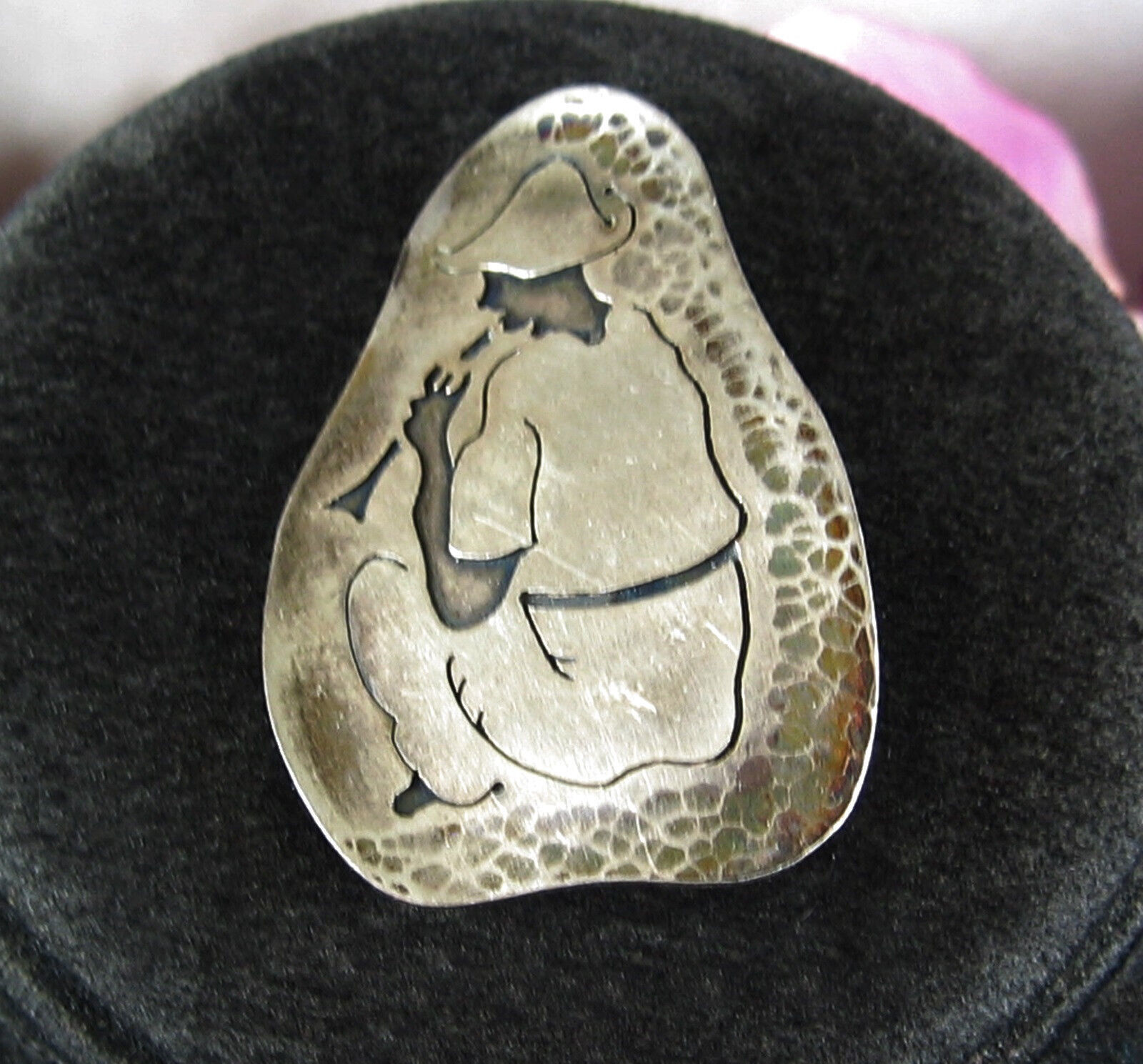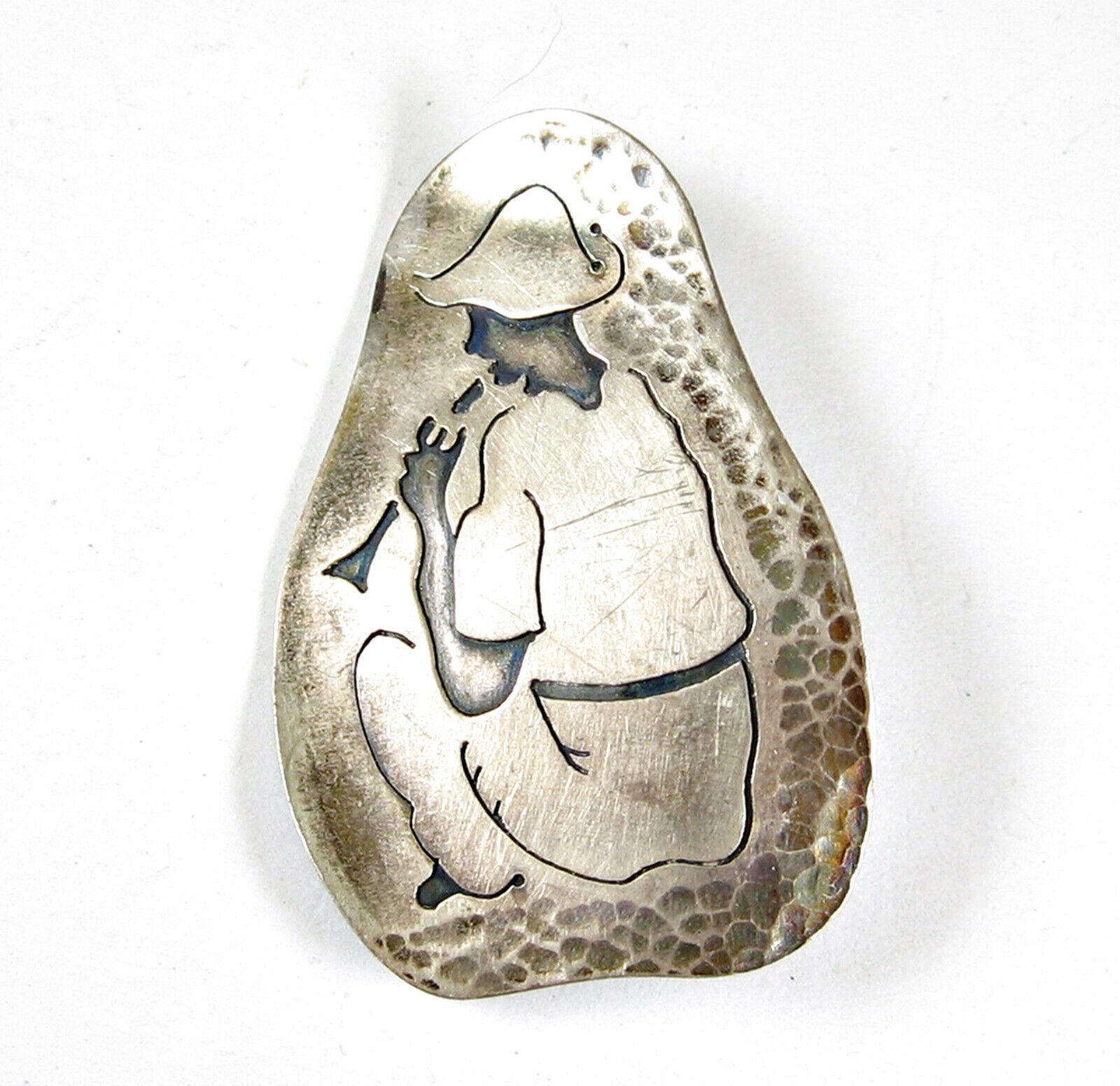 This is a Vintage SILVER Abstract Etched PIN that shows a SEATED FLUTE OR HORN PLAYER!