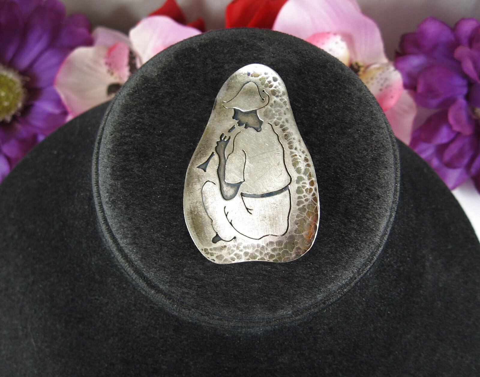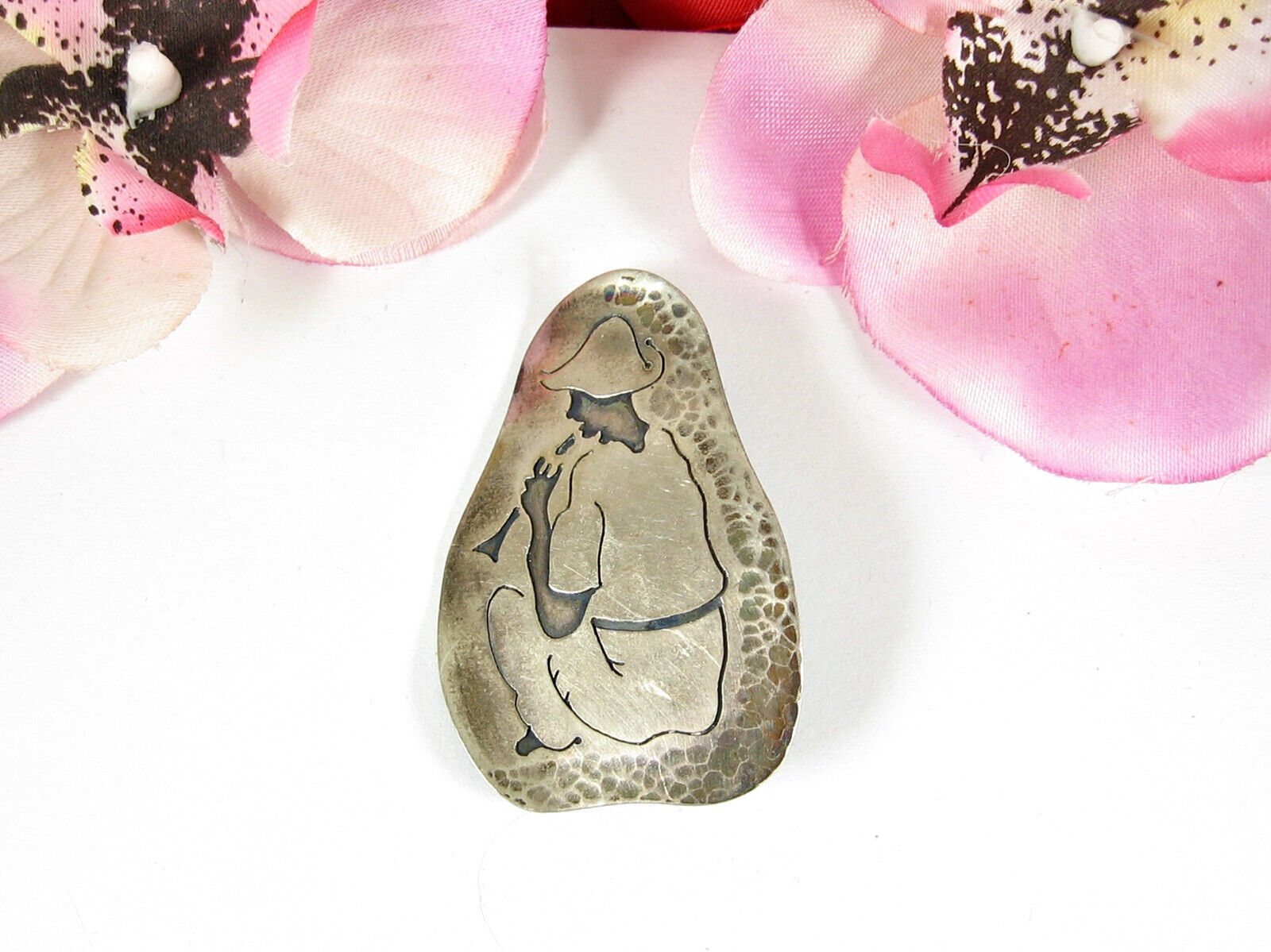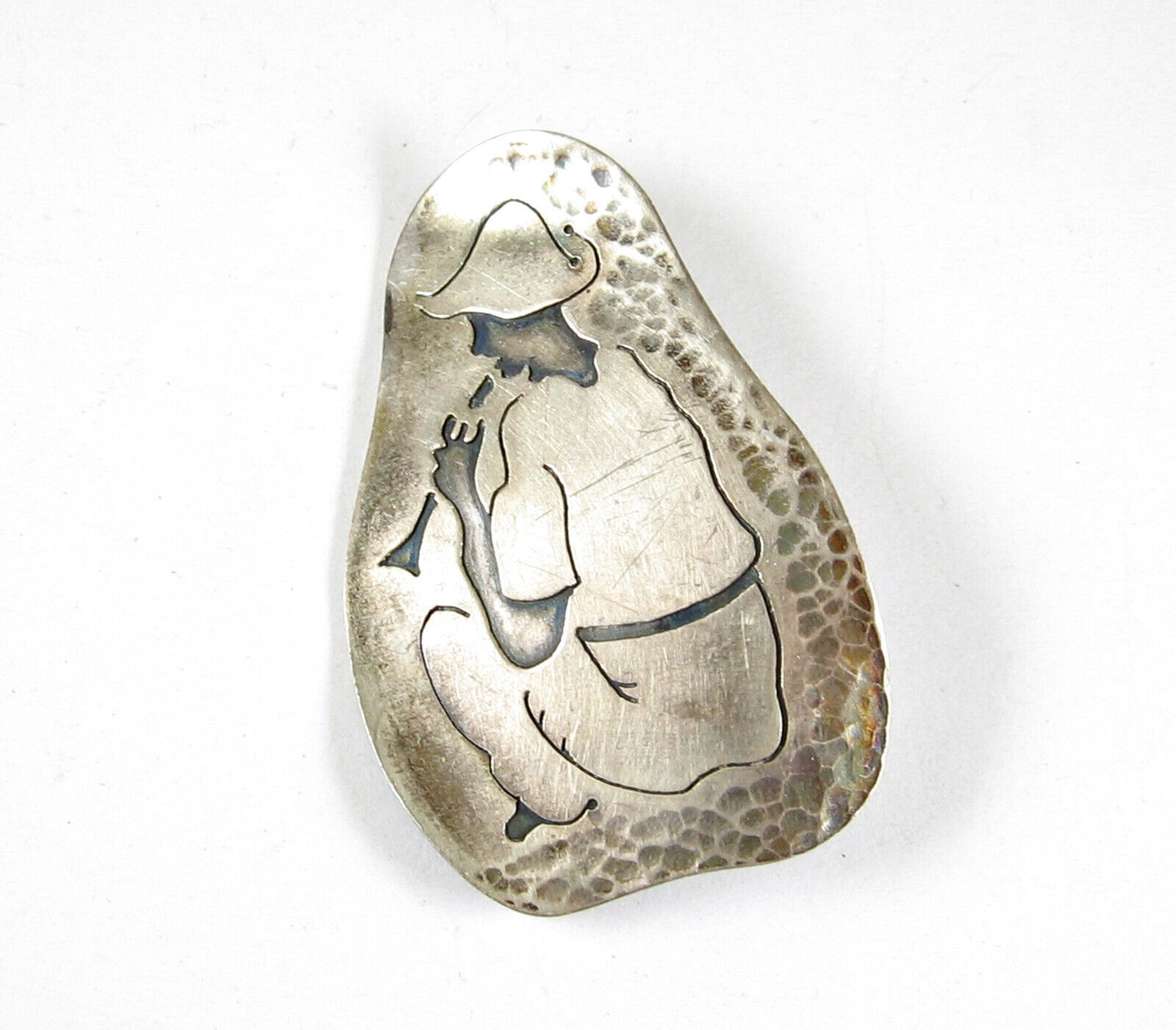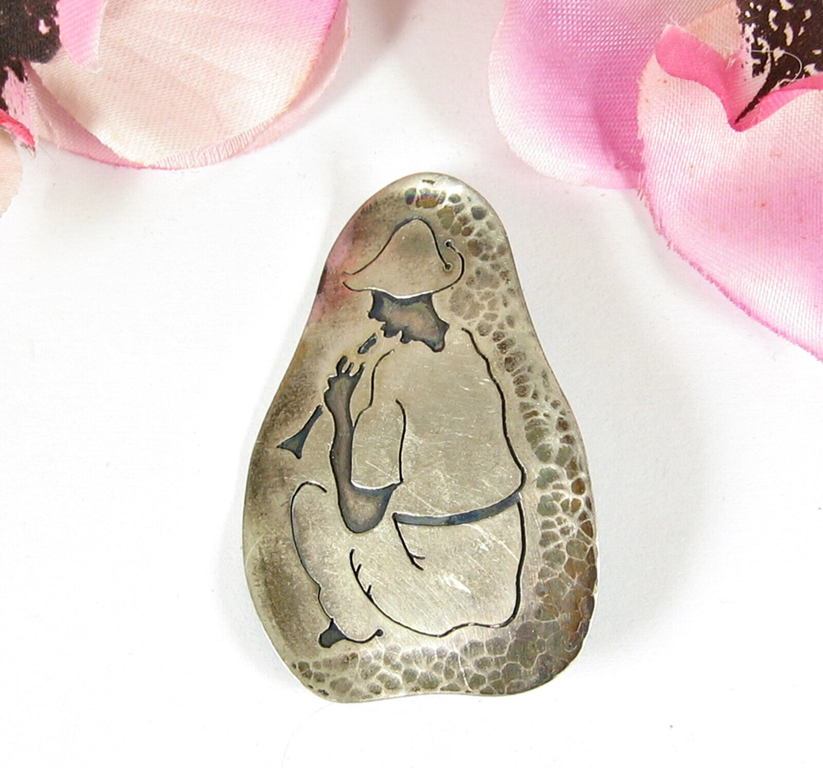 SILVER Seated HORN FLUTE PLAYER PIN Vintage BROOCH Etched Design 2" Marked