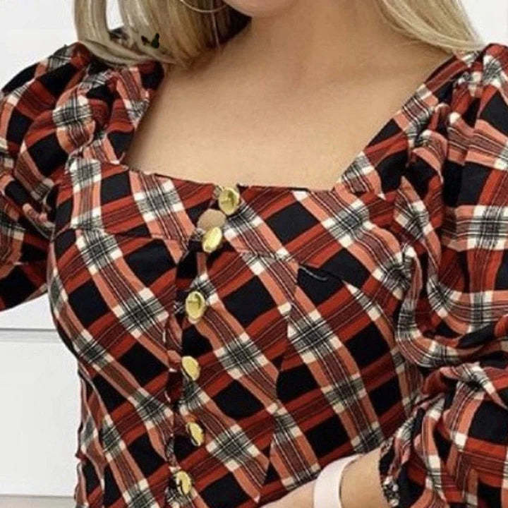 Square Neck Long Lantern Sleeves Plaid Button Blouse
