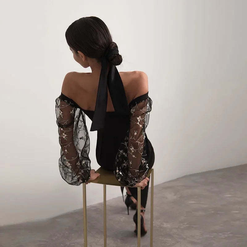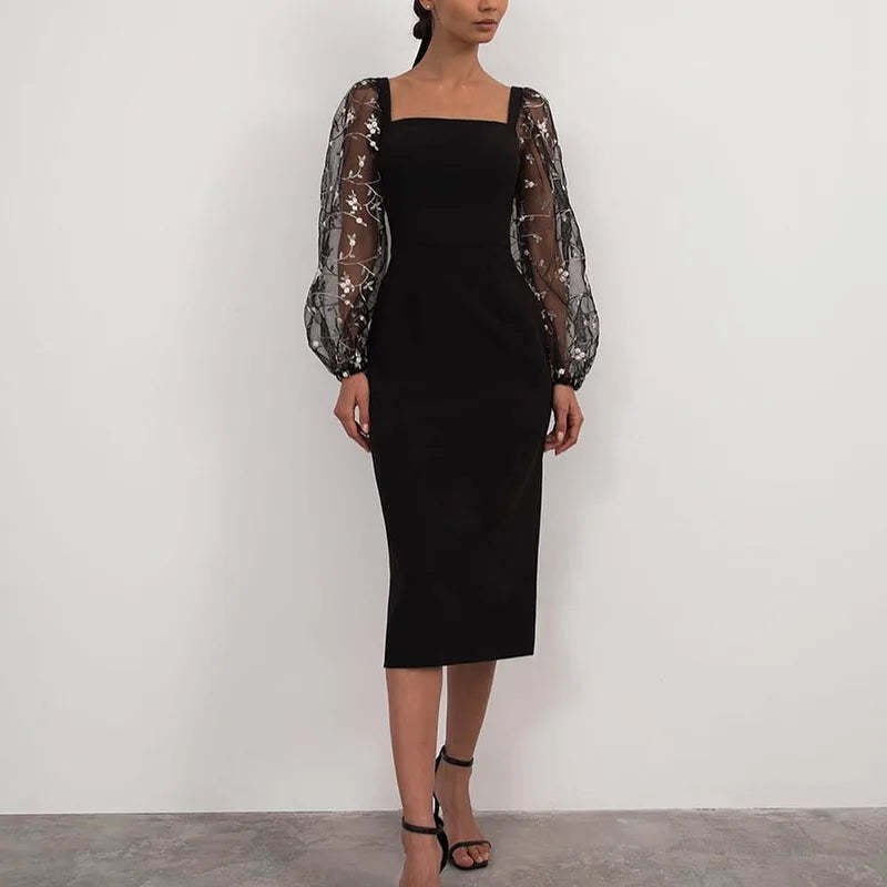 Crafted from a blend of polyester, cotton, and mesh, this Sexy Sheer Lantern Sleeve Long Dress offers a regular fit with slight stretch for comfort. Designed with a sheath silhouette and mid-calf length, it features a square neckline, full lantern sleeves, and delicate lace detailing. The patchwork pattern adds subtle texture, while the natural waistline enhances the figure. Suitable for all seasons and styled with a pullover closure, this elegant dress combines synthetic fibers for a smooth finish, perfect for sophisticated evening occasions or clubwear.