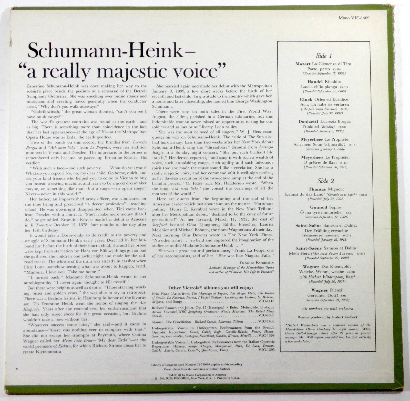 Subject keyword: La clemenza di Tito. Parto, parto / Mozart -- Rinaldo. Lascia ch'io pianga / Handel -- Orfeo ed Euridice. Ach, ich habe sie verloren / Gluck -- Lucrezia Borgia. Trinklied / Donizetti -- Le prophe?te. Ach mein Sohn ; O pre?tres de Baal / Meyerbeer -- Mignon. Kennst du das Land? / Thomas -- Sapho. O? ma lyre immortelle / Gounod -- Samson et Dalila. Der Fru?hling erwachte ; Mein Herz / Saint-Sae?ns -- Das Rheingold. Weiche, Wotan, weiche (with Herbert Witherspoon, bass) ; Rienzi. Gerechter Gott / Wagner.