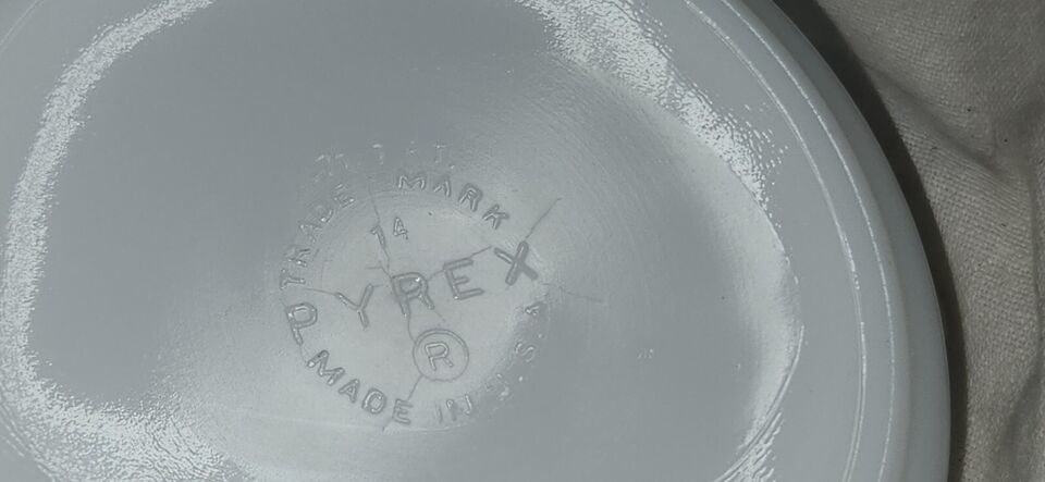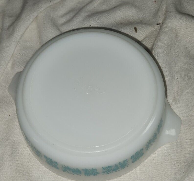 Nie condition Pyrex dish. Butterprint. White bowl with light blue print. 7.5 inches across at the handles. 6 inches across in the middle. No chips or cracks noticed.
