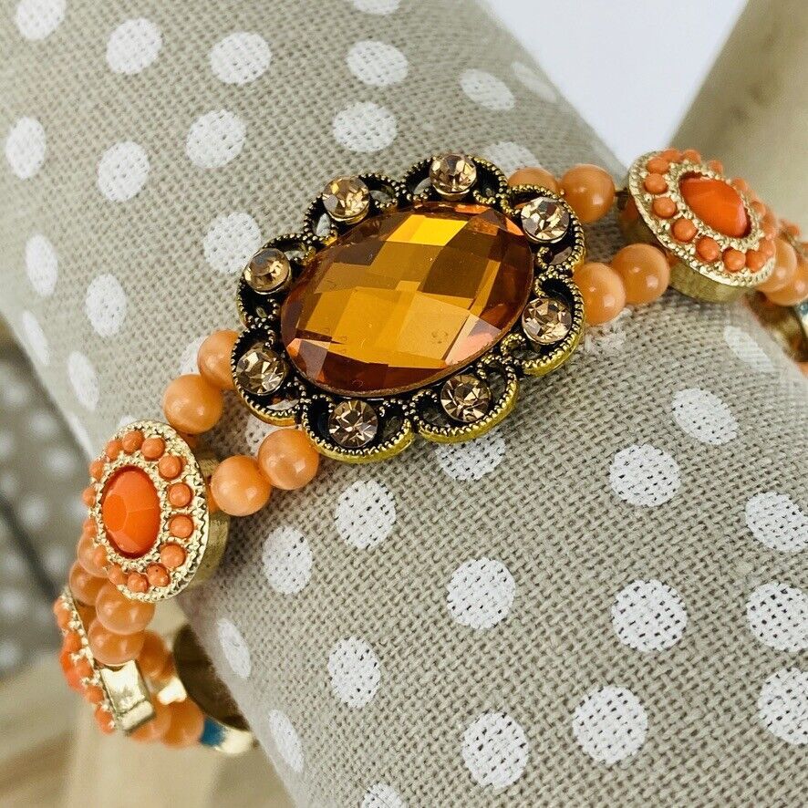Orange Czeh Glass Rinestone Bracelet Gold Tone Boho Handmade Cuff