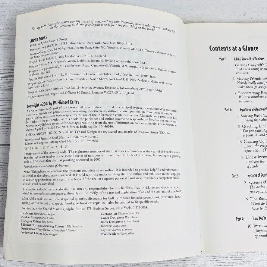 The Complete Idiot's Guide To Algebra 2nd Edition Paperback 2007 Michael Kelley