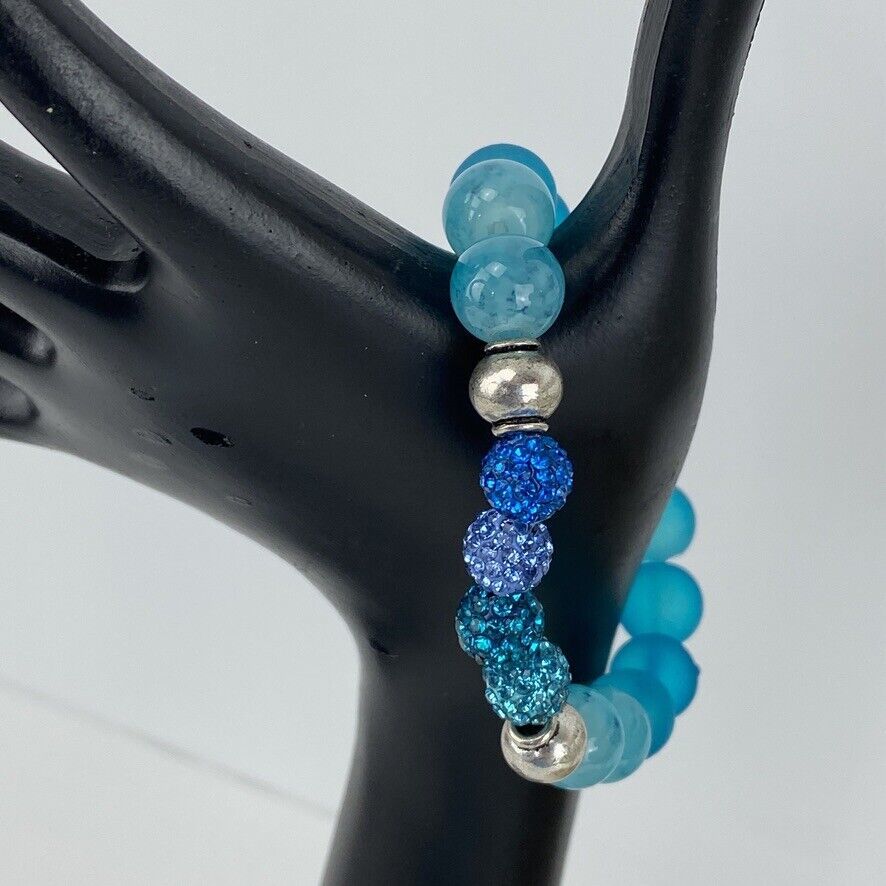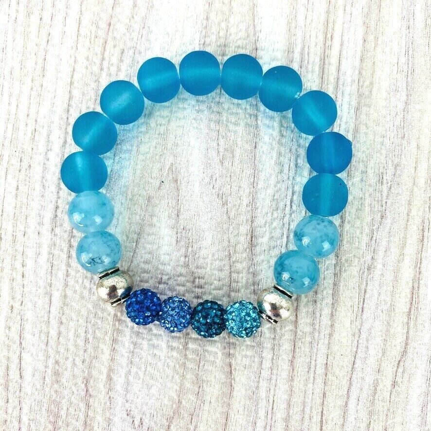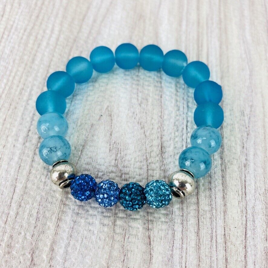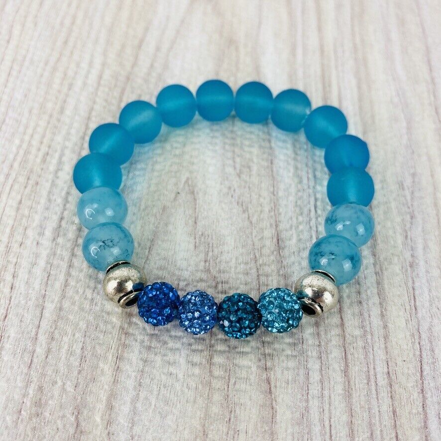 Blue Aquamarine Beads Bracelet Sea Glass Silver Rhinestones Handmade