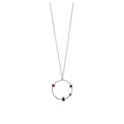 Rhodium Plated Sterling Silver Garnet and Hammered Circle 16" + 2" Necklace