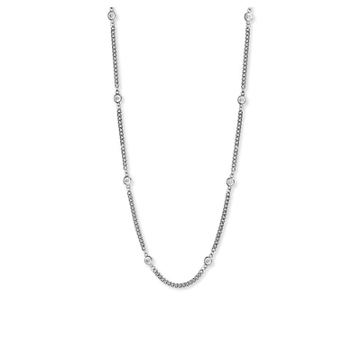 Measuring 16 inches in length with an additional 2 inches for adjustable wear, this necklace is versatile and can be customized to your desired length. The centerpiece of this chic accessory is a series of dazzling 3.5mm bezel-set CZs stationed along the rhodium plated curb chain, adding just the right amount of shimmer and elegance to your look.