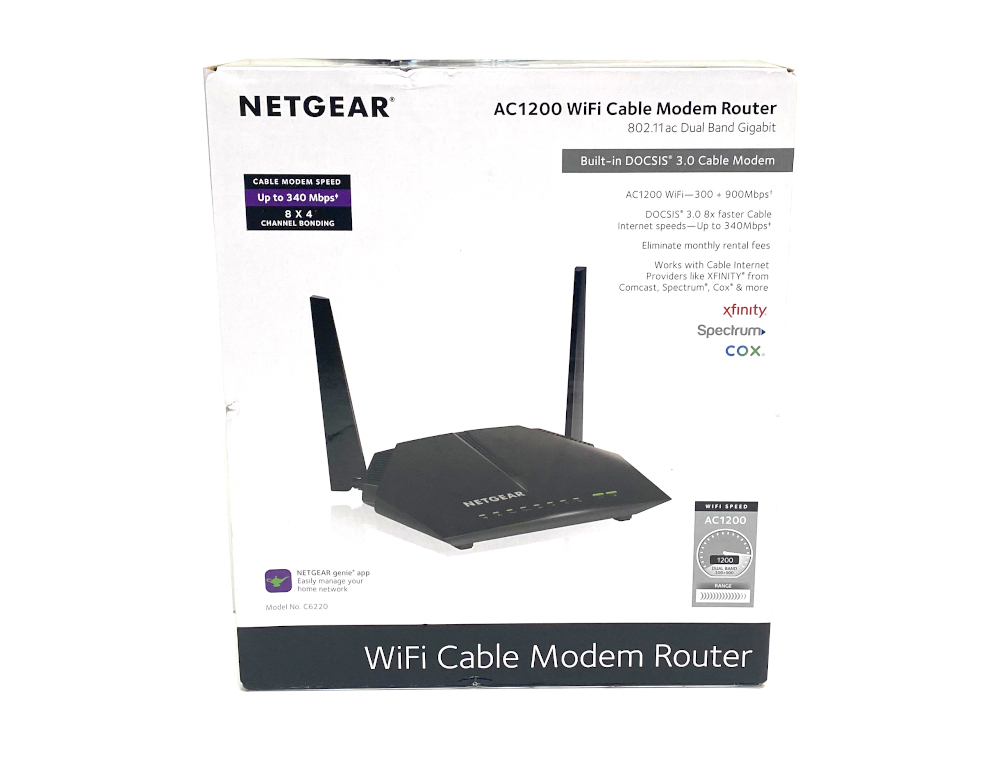 Type: ModemBrand: NetgearModel number: C6220Size: 1200 MbpsColor: BlackModel name: AC1200 Wifi Cable Modem RouterCondition:New (Open Box)Notes:opened to verify contents