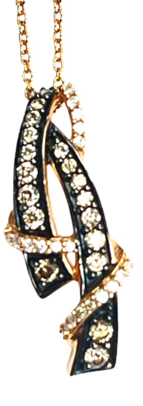 Type: NecklaceWeight: 2.0Karat: 14ktMetal: Yellow GoldGender: Women'sStyle: DangleSize / Length: 18"Owner applied: 14kStone 1 quantity: 39Stone 1 shape: RoundStone 1 color: ClearStone 1 weight (total): 1.00Brand: Le VianStone 1 type: DiamondCondition:Used