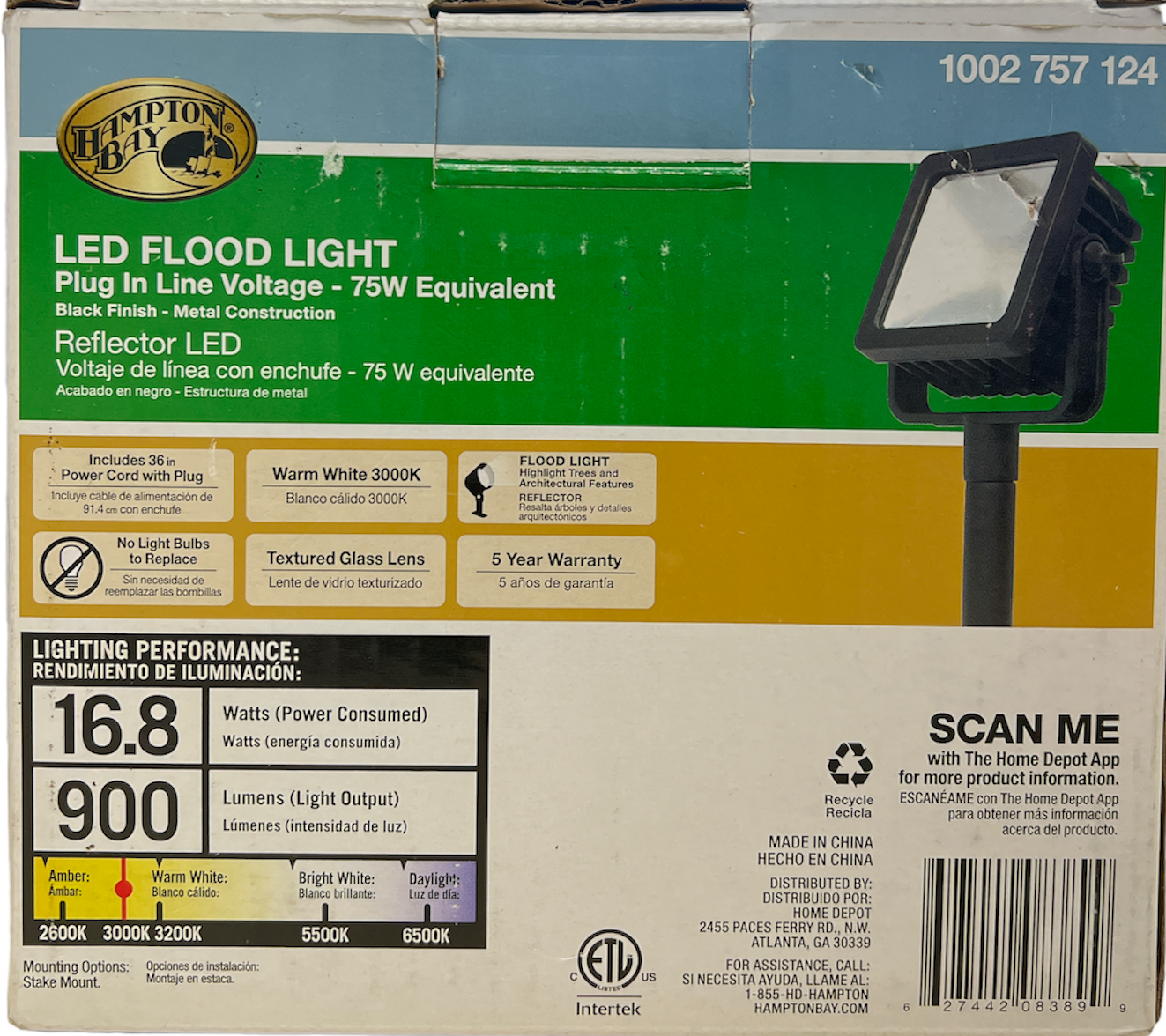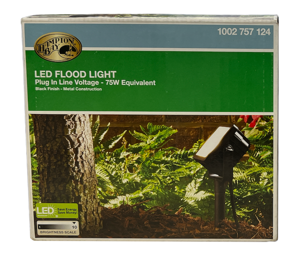 Type: LightsBrand: Hampton BayModel: 1002 757 124Color: BlackSize: 75wCondition:New (Sealed)Notes:HAMPTON BAY Low Voltage lED Flood Light 1002 757 124 Black New
