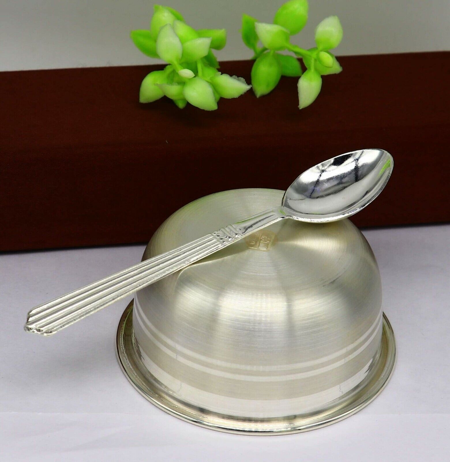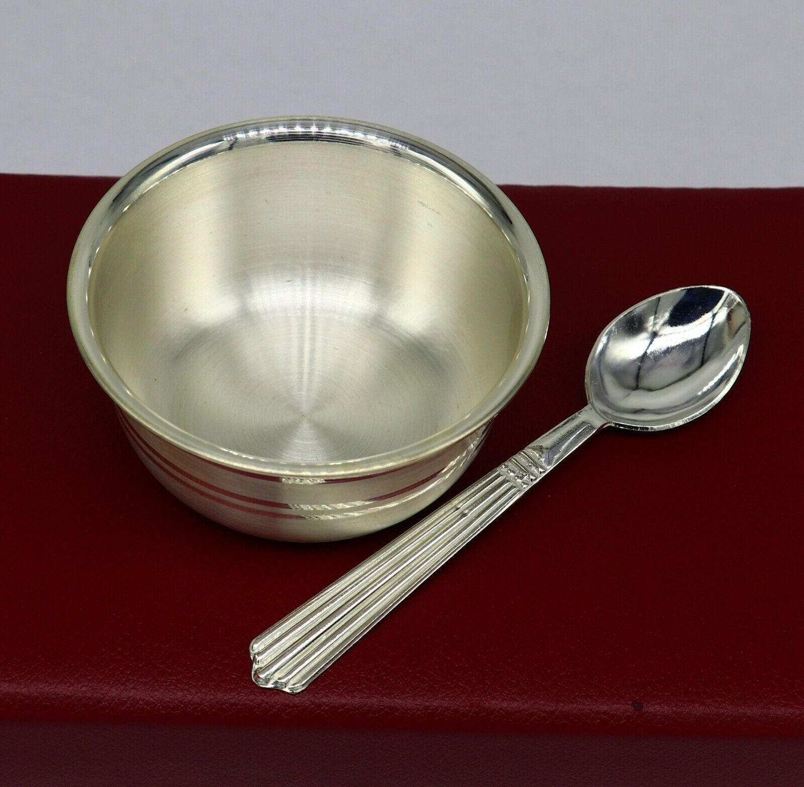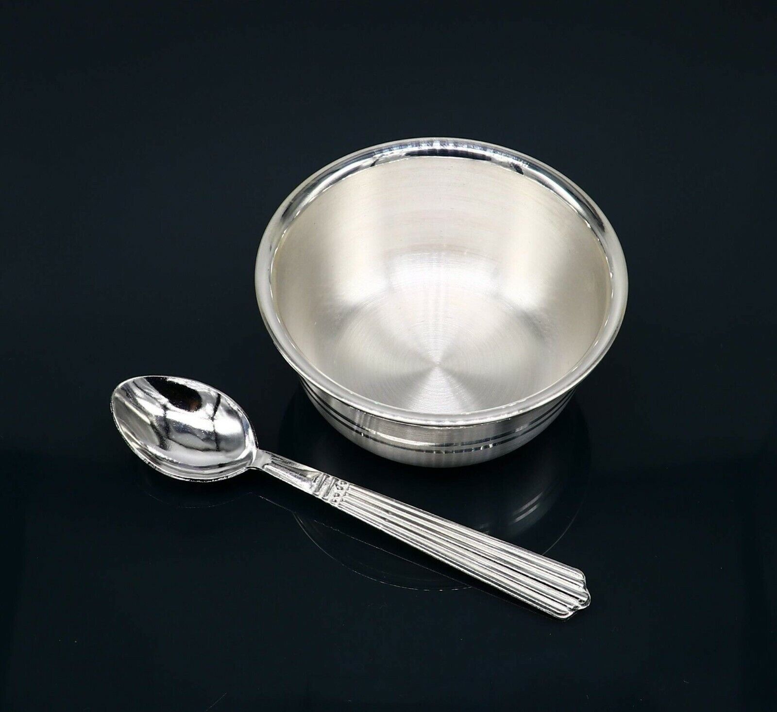 999 fine silver handmade bowl and spoon set, excellent gifting home dining decorative silver vessels, Indian opinion is silver has proven antibacterial properties. It is believed that eating out of the same is healthy and can help prevent disease-causing bacteria from spreading. This is one of the main reasons medicines are given to babies in silver bowls or trays. we can also use as worshipping/ puja utensils.