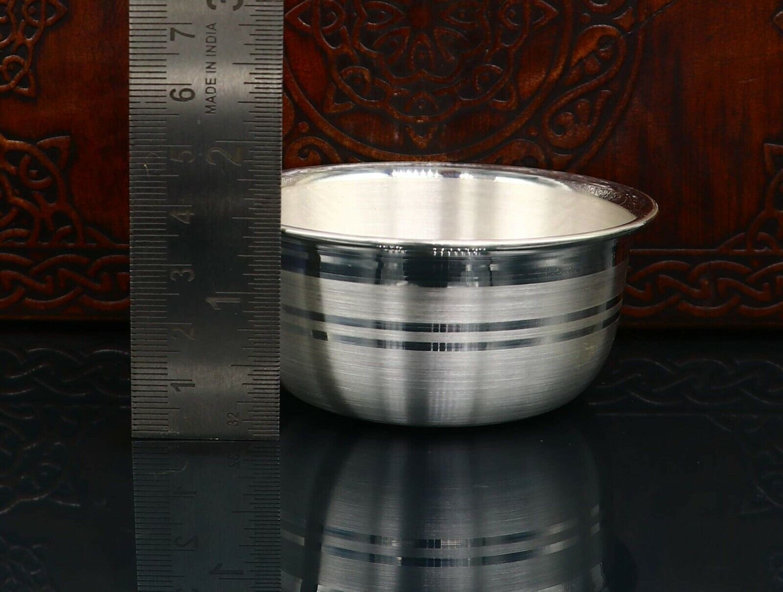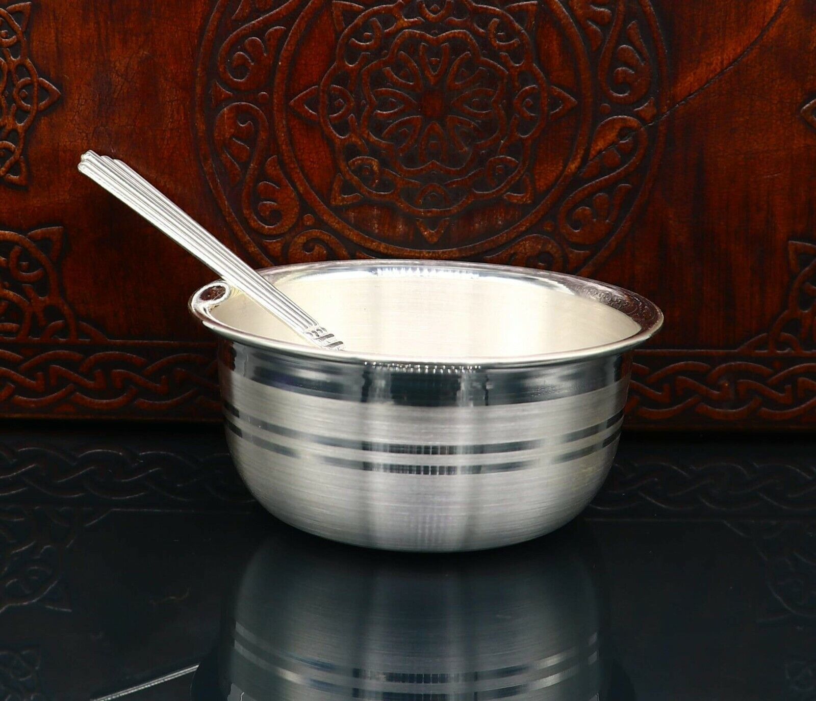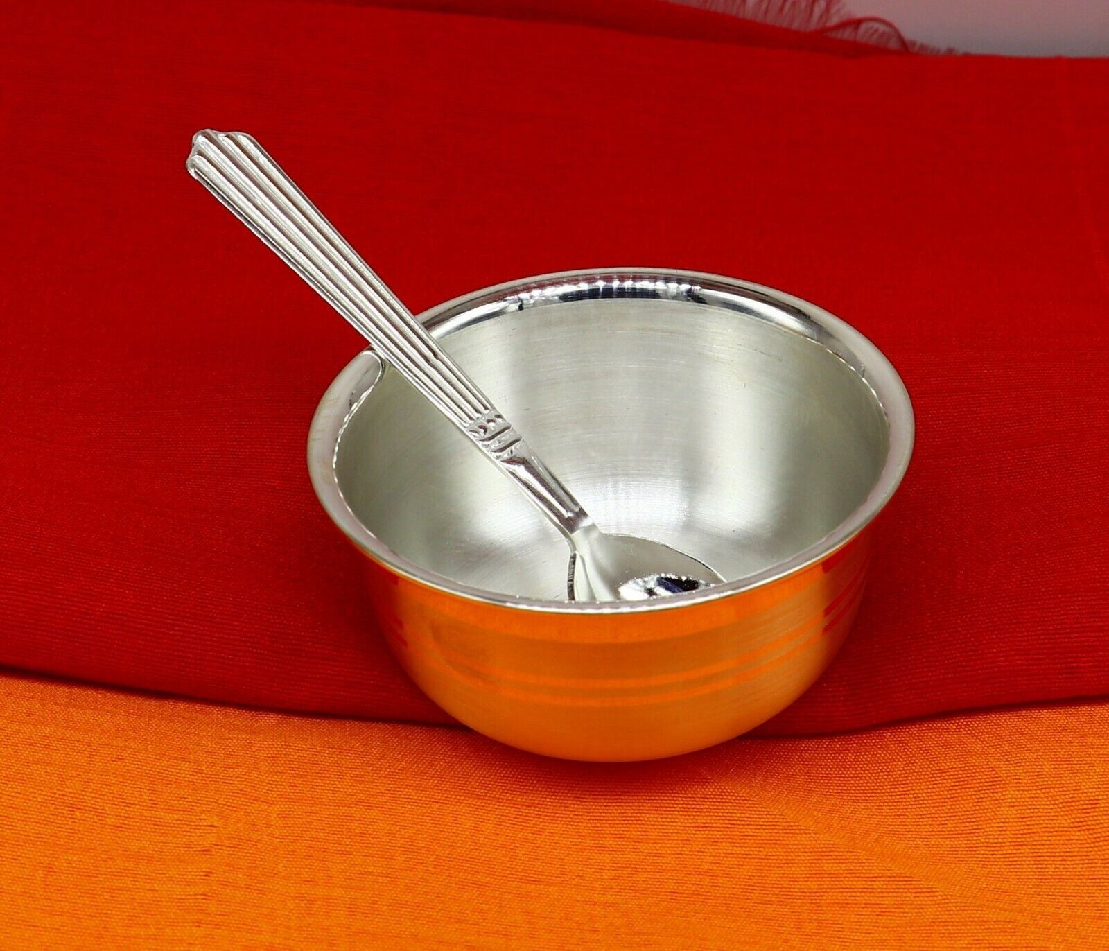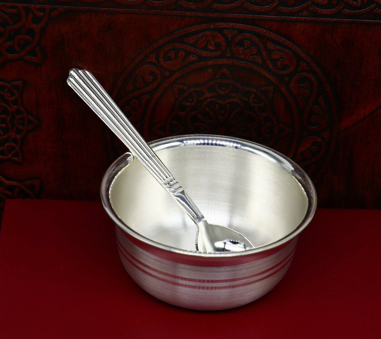 999 fine silver handmade bowl and spoon set, excellent gifting home dining decorative silver vessels, Indian opinion is silver has proven antibacterial properties. It is believed that eating out of the same is healthy and can help prevent disease-causing bacteria from spreading. This is one of the main reasons medicines are given to babies in silver bowls or trays. we can also use as worshipping/ puja utensils.