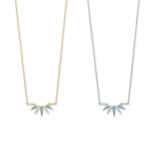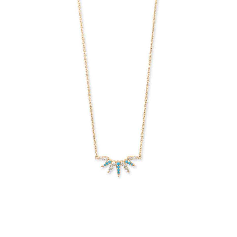 Crafted with meticulous attention to detail, this spectacular necklace features a radiant sunray design adorned with 1-1.5mm synthetic turquoise stones and sparkling round-cut cubic zirconia. The vibrant turquoise creates a captivating pop of color, while the CZs add a touch of brilliance and elegance.