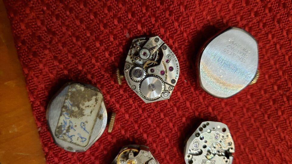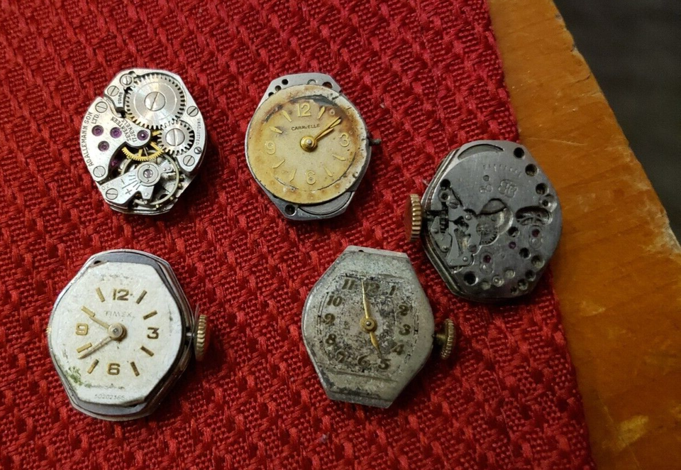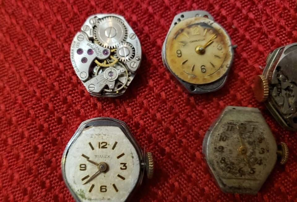 NEW Vintage 60's 50's Ladies Watch Movement Caravelle Hamlin dial stem white 17J you get one Timex, Caravelle, Ad Allemann, Hamlin and another unknown NOTE - this is a rare Watch Partial Movement LOT. I do not know the model or the timeframe this watch was made. If you know something please let me know. this is a piece of history. If you are into old watches this is a nice show piece. If you fix old watches you are in luck. I am not an expert on watches. I bought a big lot of old watch parts from a family watch-repair business that went to auction. They had been in business for 100 years. PLEASE - check out my other vintage watch parts we will be listing more over the next number of months. I will give you a deal if you want multiple orders!! FREE USA SHIP