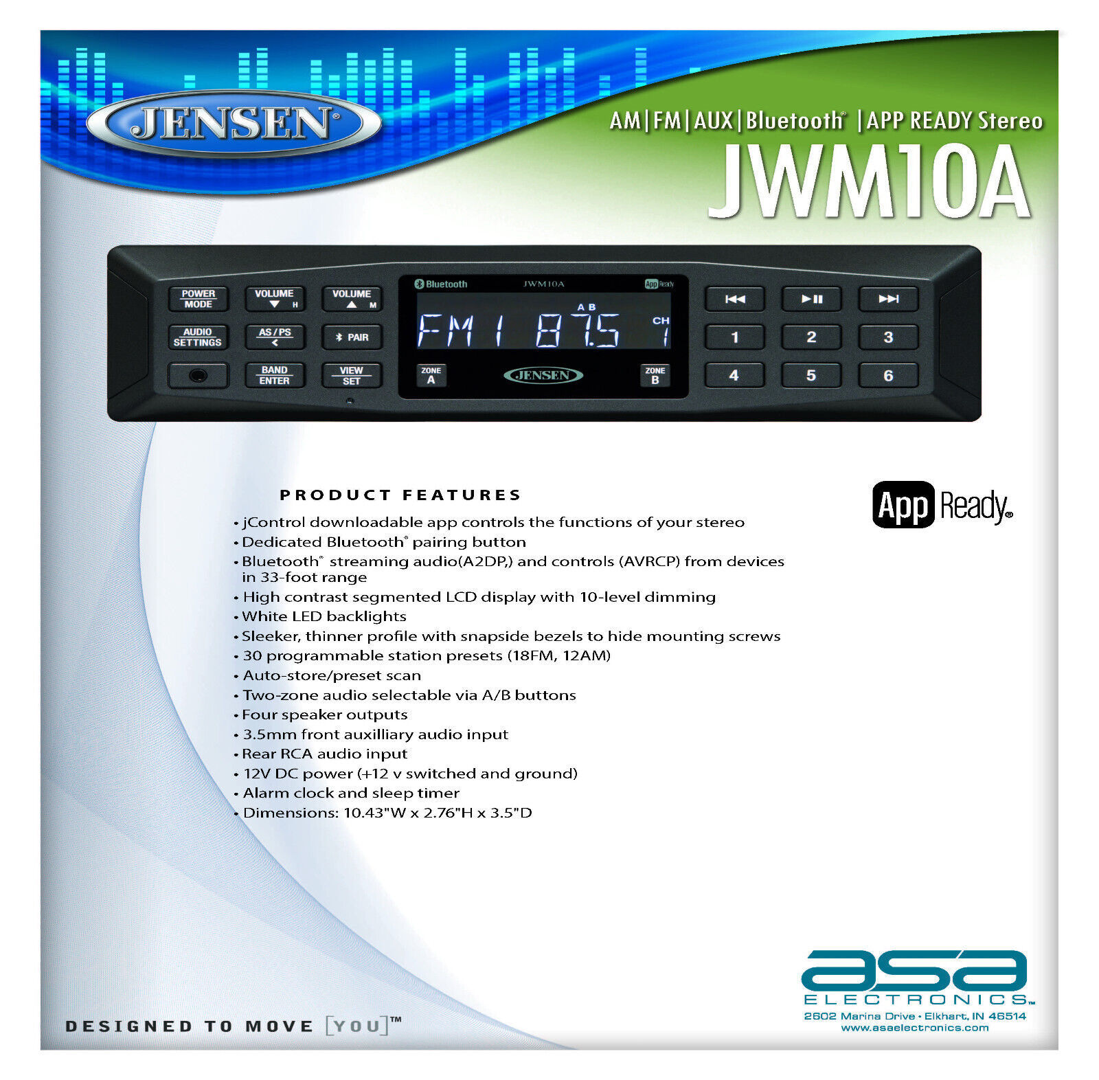 ASA Electronics continues to expand their impressive line of JENSEN audio equipment with the JWM10A. The JWM10A boasts two speaker zones and four speaker outputs. Campers can enjoy a customized AM/FM listening experience with 12AM and 18FM station presets and preset scanning. Bluetooth streaming capability gives the JWM10A a truly endless music library. This stereo?s dedicated Bluetooth pairing button will connect with any Bluetooth-enabled smart device within a 33-foot range with ease. The JWM10A is App Ready so campers can navigate through their station presets and other stereo functions, including the control of the two speaker zones, right from their smartphones. The jControl app from JENSEN is available as a free download for Android and Apple devices. jControl will sync with the JWM10A to remember favorite settings and preset stations for a more tailored experience.