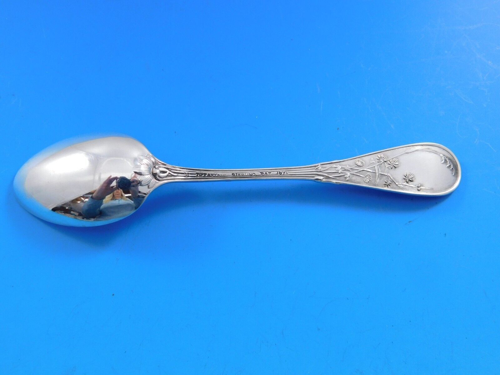 Beautiful sterling silver 4 O'Clock Coffee Spoon 4 3/4" in the multi-motif pattern Japanese by Tiffany and Co. The handle of this piece features a Japonesque bird perched on a branch, surrounded by foliage. It is not monogrammed and is in excellent condition.