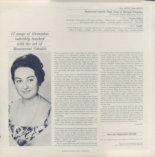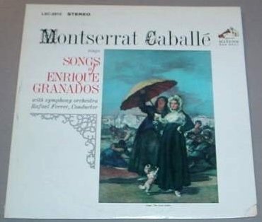 Product description: STEREO VINYL LP! Montserrat Caballe Sings Songs of Enrique Granados! Rafael Ferrer, Conductor. 1966 RCA Victor Red Seal Release! TRACKS: A1. Canciones Amatorias: Descubrase El Pensamiento De Mi Secreto Cuidado; A2. Canciones Amatorias: Mananica Era; A3. Canciones Amatorias: Llorad, Corazon, Que Teneis Razon; A4. Canciones Amatorias: Mira Que Soy Nina, !Amor, Dejame!; A5. Canciones Amatorias: No Lloreis, Ojuelos; A6. Canciones Amatorias: Iban Al Pinar; A7. Canciones Amatorias: Gracia Mia; B1. Tonadillas: La Maja Dolorosa No. 1; B2. Tonadillas: La Maja Dolorosa No. 2; B3. Tonadillas: La Maja Dolorosa No. 3; B4. Tonadillas: El Tra la la y el Punteado; B5. Tonadillas: El Mirar de La Maja; B6. Tonadillas: Callejeo; B7. Tonadillas: Amor y Odio; B8. Tonadillas: El Majo Discreto; B9. Tonadillas: El Majo Timido; B10. Tonadillas: La Maja de Goya.