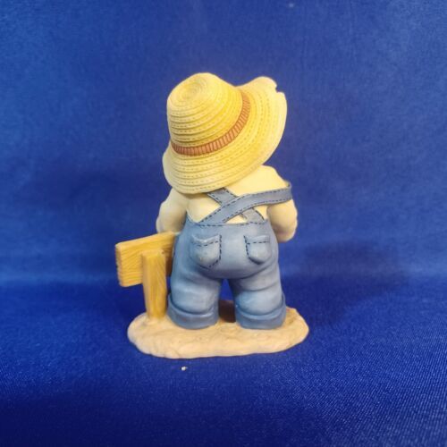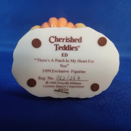 This adorable Cherished Teddies figurine is a must-have for any collector. Featuring a pumpkin patch theme with the lovable character Ed, this small-sized figurine is sure to bring a smile to your face. While there is a small chip on the hat, it does not detract from the overall charm and appeal of this piece.