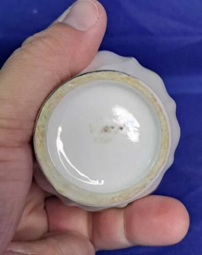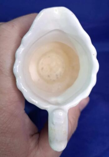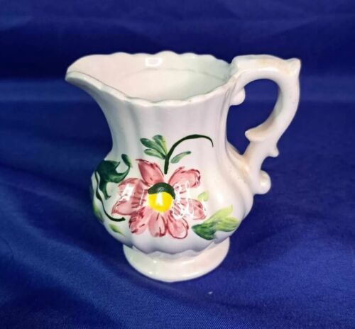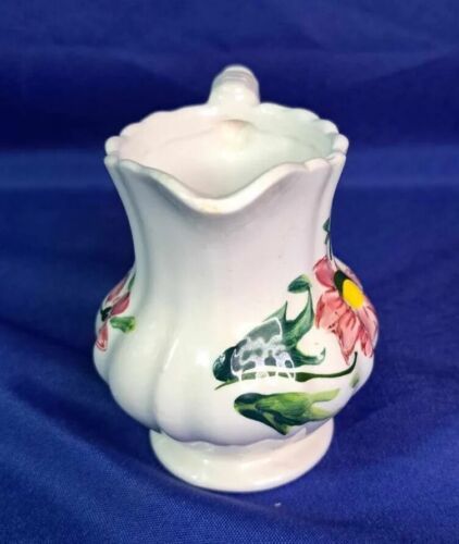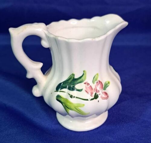 This vintage ceramic creamer features a charming floral design with delicate pink and green flowers hand-painted on a white background. With a capacity of 4 ounces, it is perfect for serving cream or milk. The creamer has a lovely vintage feel and would make a beautiful addition to any collection of ceramic pottery.