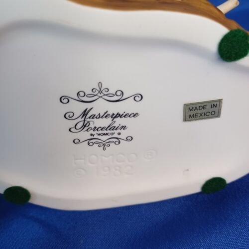 This vintage porcelain figurine features a charming squirrel with a collection of acorns. The intricate hand-painted details bring this country wildlife scene to life, with rich earth tones of grays, browns, golds, and tans. The Masterpiece Porcelain by Homco piece was manufactured in Mexico in the late 20th century and measures 6 inches tall and 6 inches wide.