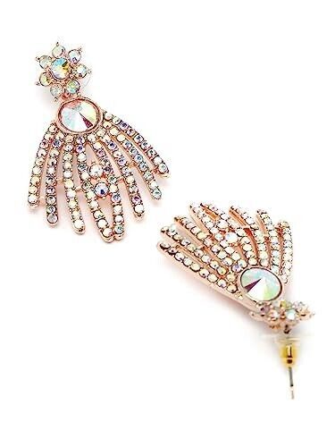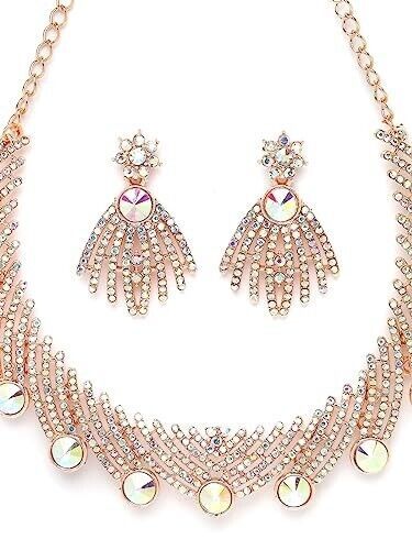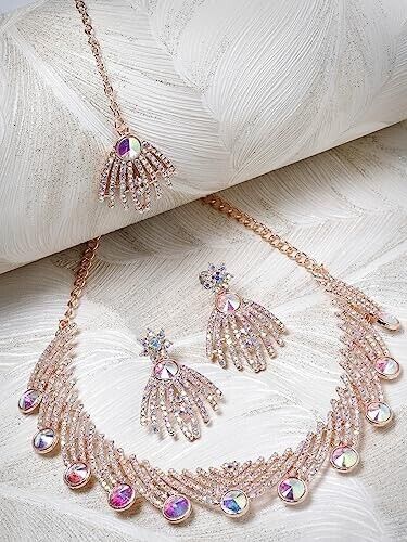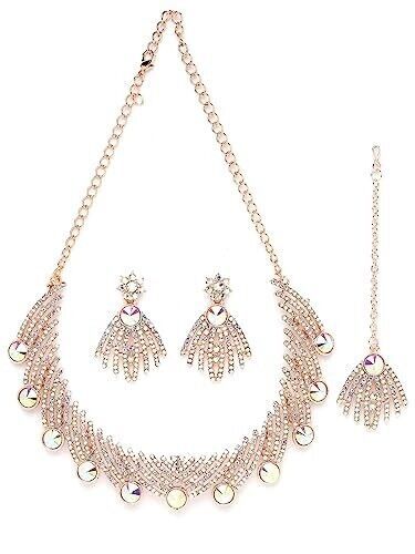 Ideal Gift Choice: The Sukkhi Spunky Rose Gold Plated Rainbow Stones Collar Bone Necklace Earring with Maangtika Jewellery Set makes for an ideal gift choice for women, whether it's for a birthday, anniversary, or any other significant event. Its spunky design and captivating rainbow stones are sure to be loved by the recipient.