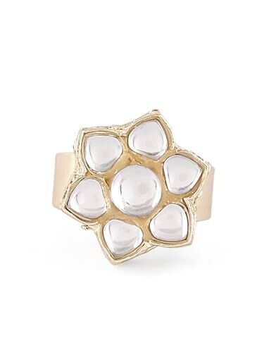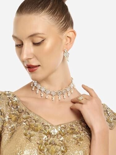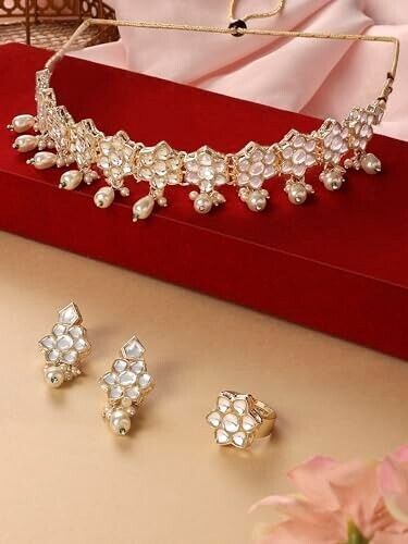 Gold Tone Kundan Beads Choker Necklace Earring & Ring Set For Women Jewelry Set
