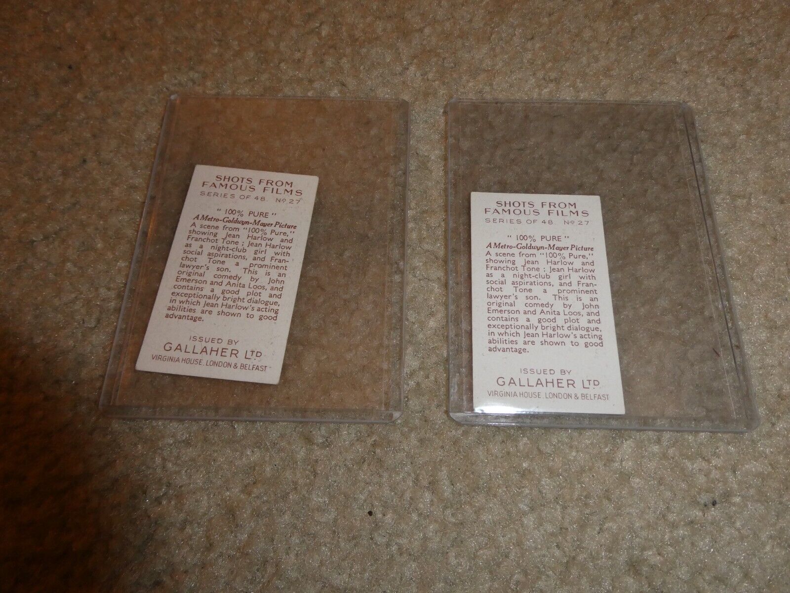 A very nice lot of 2 of the vintage 1935 Gallagher Ltd, cigarette card, Shots from Famous Films, card number 27, 100% Pure, featuring Jean Harlow as shown, in the picture. Nice looking cards for the age, wear to the corners as shown, mid grade or so. Zoom in for details.