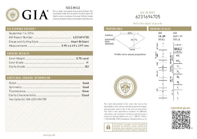 Diamond Information: Gem Type: Center Stone(s): Diamond Gem Creation Method: Earth Mined Stone Shape: Heart Number Of Stones: 1 Color: H Clarity: SI2 Stone Treatment: Center Stone:Not Treated Carat: 0.7 Ct Measurement: 5.95x6.49X2.97 Certificate Info: Cert Info: GIA - 6231694705 Symmetry: Good Polish: Good Total Depth: 45.7 CaratsDirect2U #: 612
