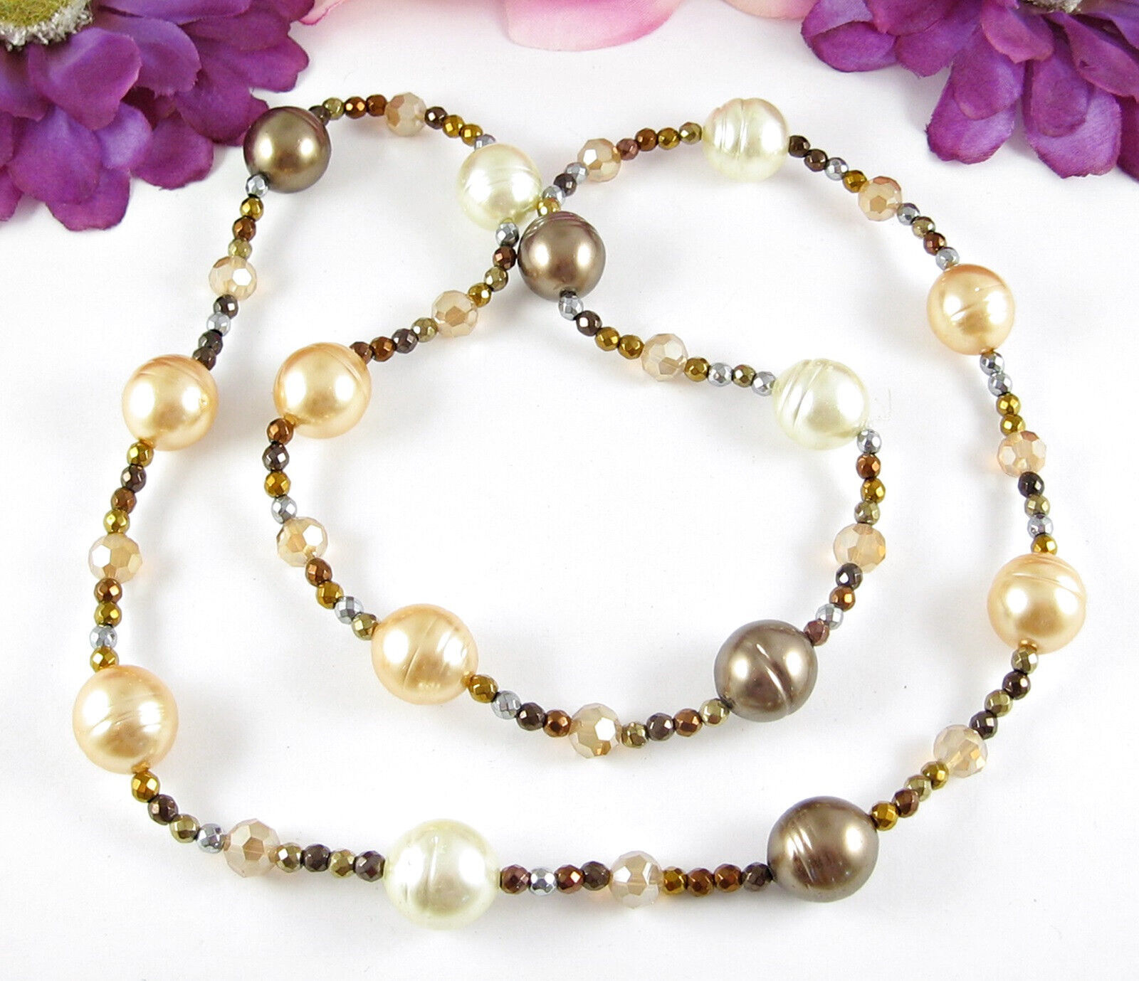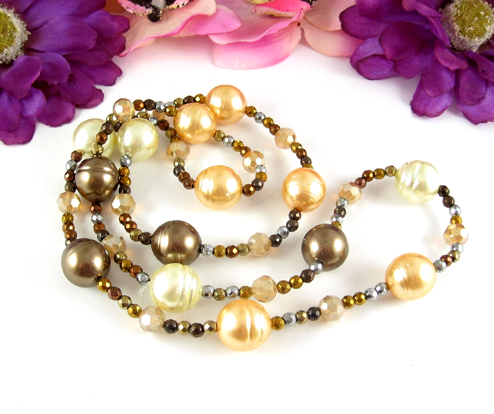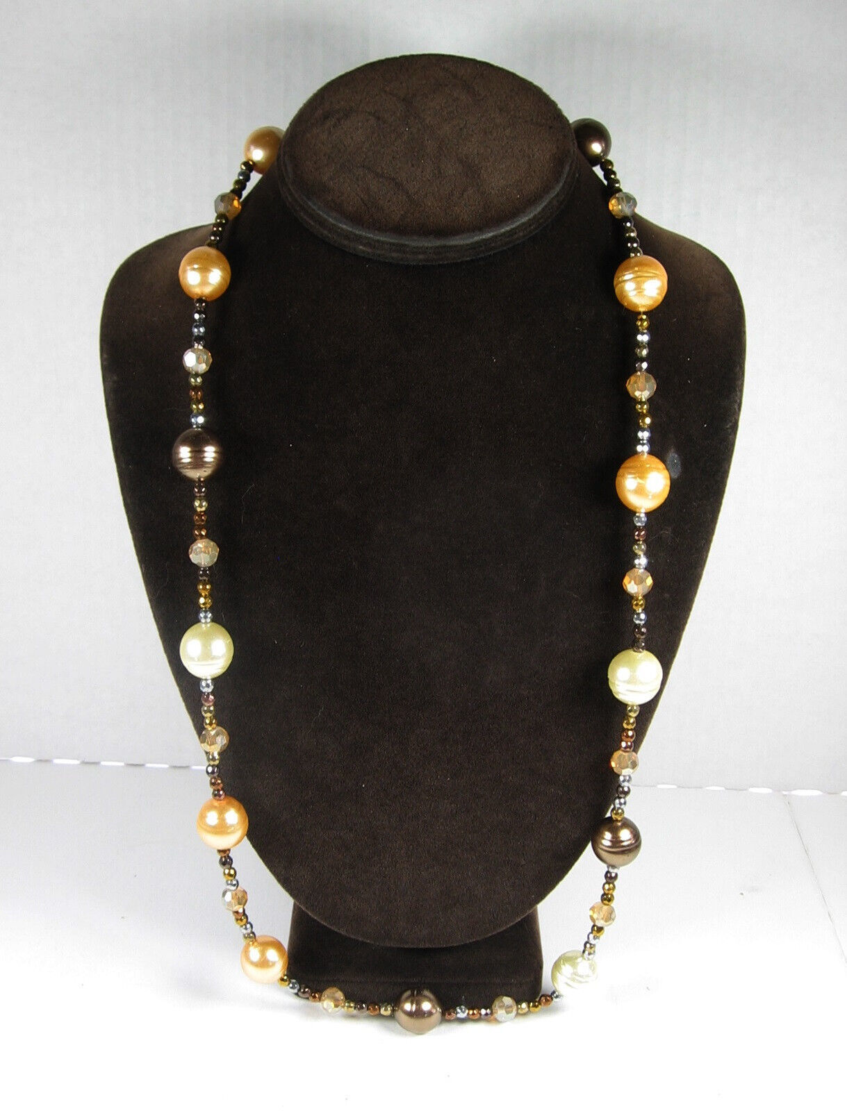 SPARKLY Glass & Metal BEADED Vintage NECKLACE Coppertone Cream Orange AB 30"