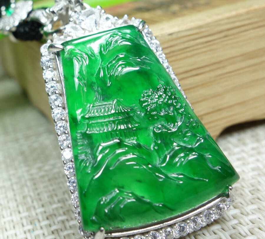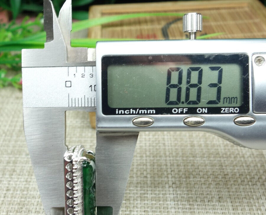 Overall size of pendant : Height of jadeite:44.5mm (1.75inches), thickness of jadeite:8.8mm (0.34 inches), width of jadeite:23.2mm (0.91 inches?