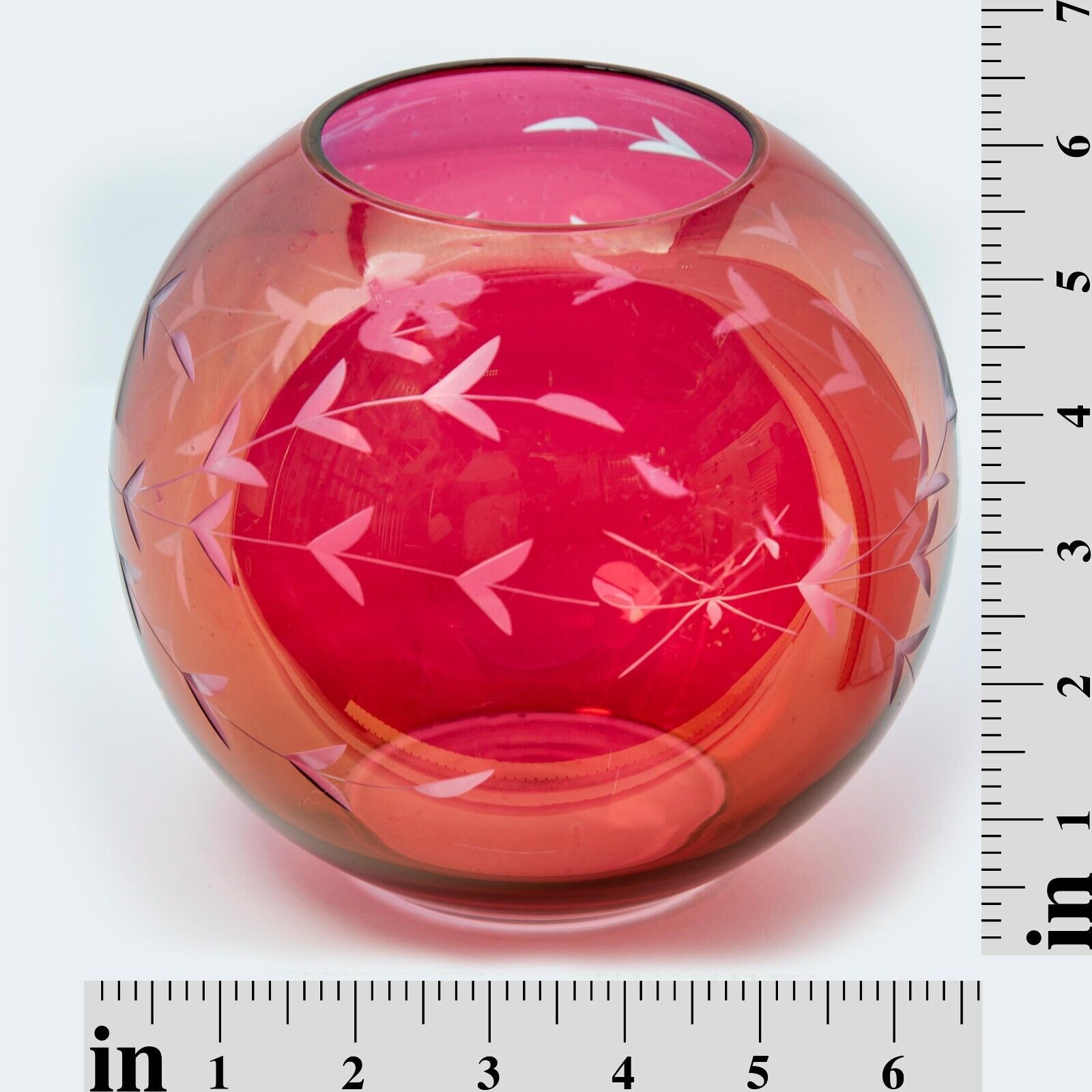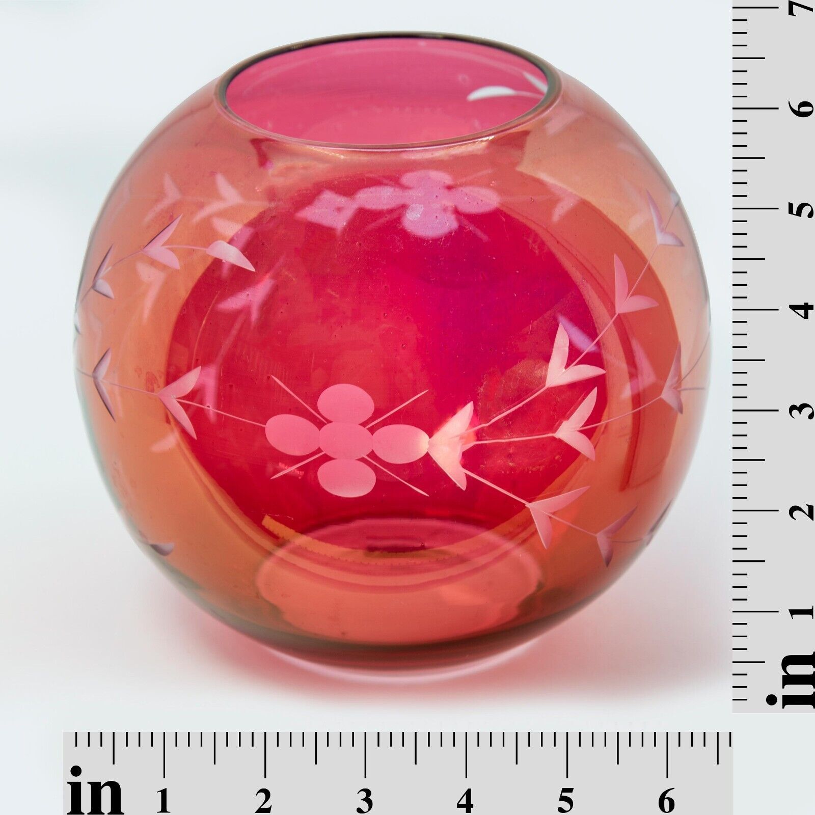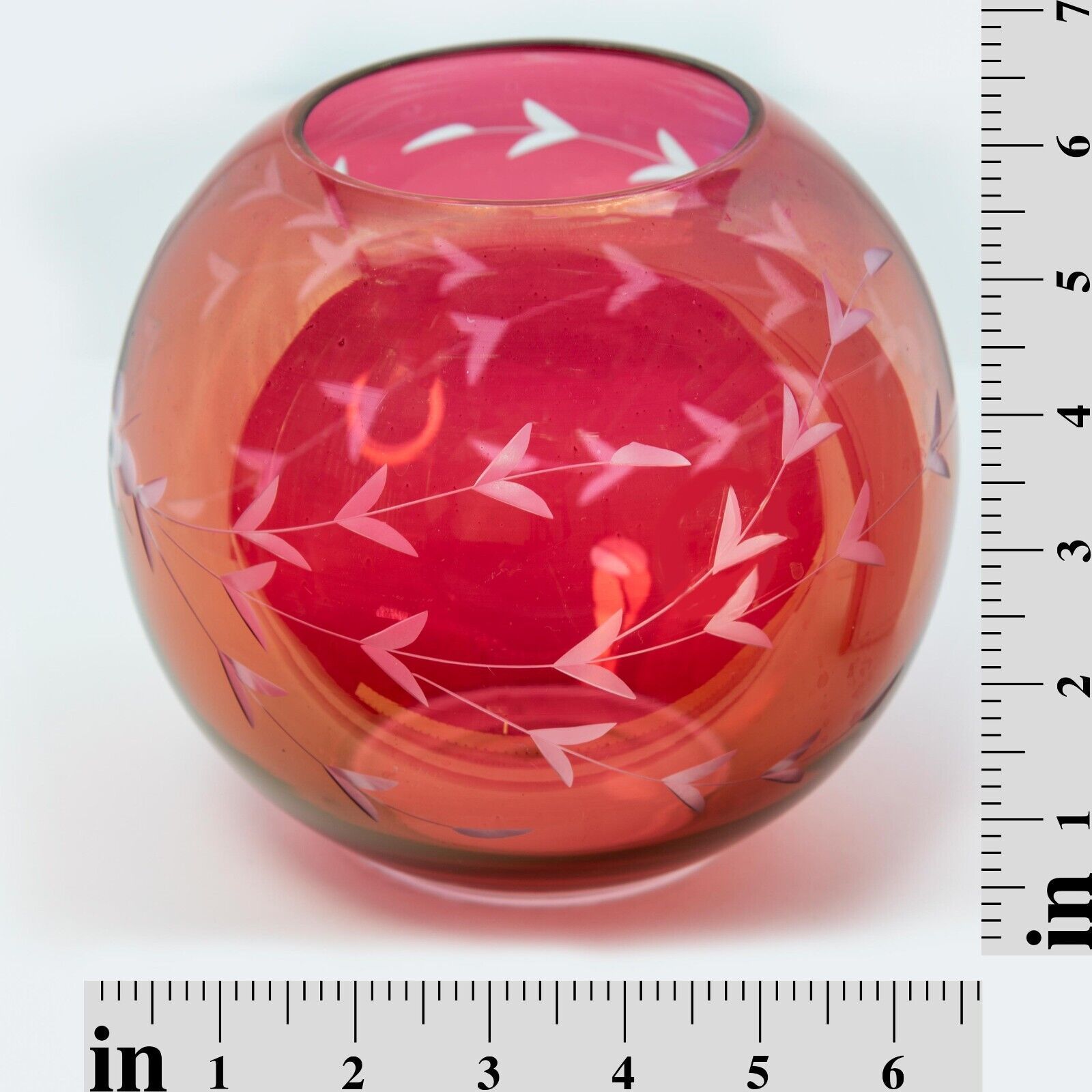 This stunning Etched Vine Red Round Vase is the perfect addition to any home decor. The intricate etched vine design adds a touch of elegance and sophistication to the already beautiful red glass. This vase would make a lovely centerpiece or accent piece in any room. The round shape allows for versatility in arrangement options, while the vivid red hue adds a pop of color to any space. Don't miss out on the opportunity to own this gorgeous piece of glassware.