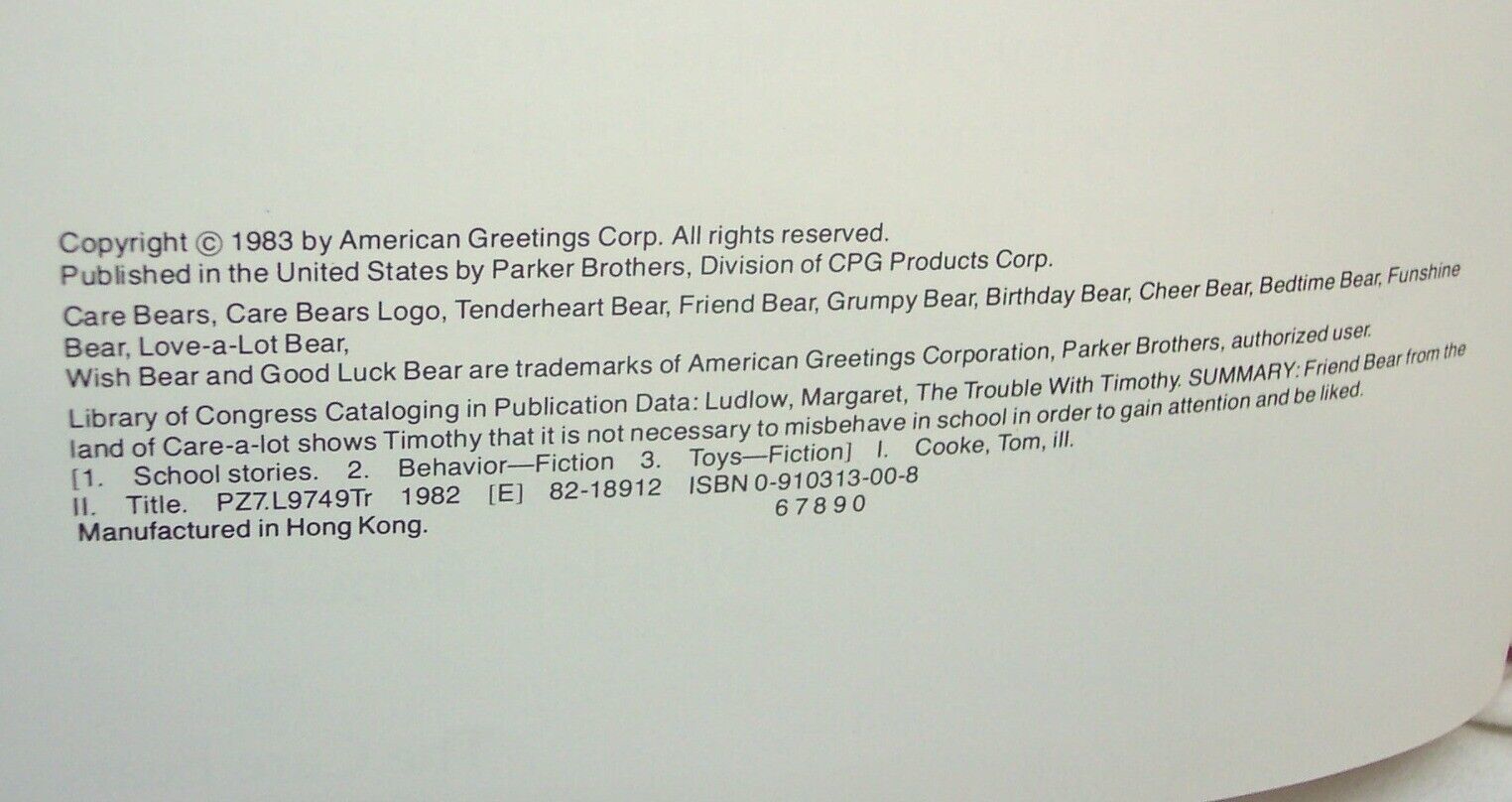 This is a VINTAGE A Tale From The CARE BEARS The Trouble with Timothy HARDCOVER BOOK from 1983. Overall in Great Condition. Very Very minor wear from use. No Tears, missing pages or writing inside. Very Well Taken Care of. It is an official PARKER BROTHERS STORY BOOK. Written by Margaret Ludlow. Pictures By Tom Cooke. EAG