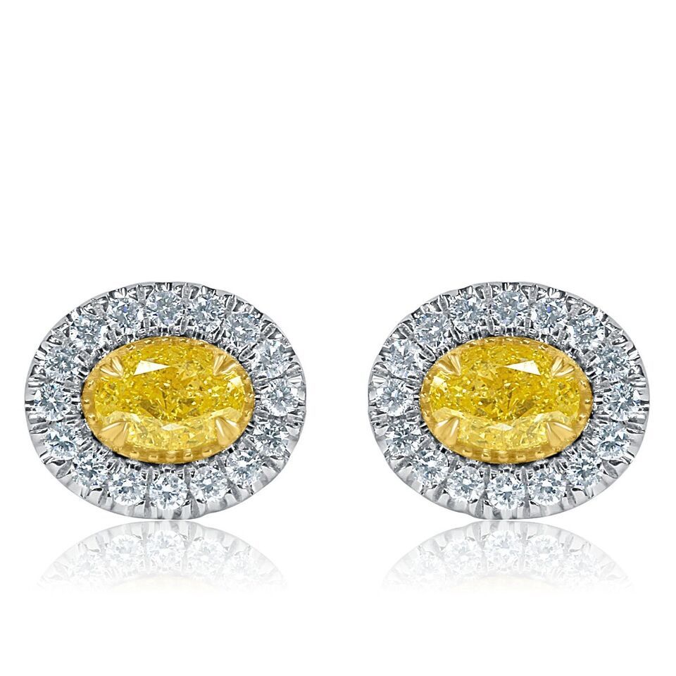 Authenticity Guarantee 1.44 CT Oval Halo Natural Fancy Yellow Diamond Stud E...