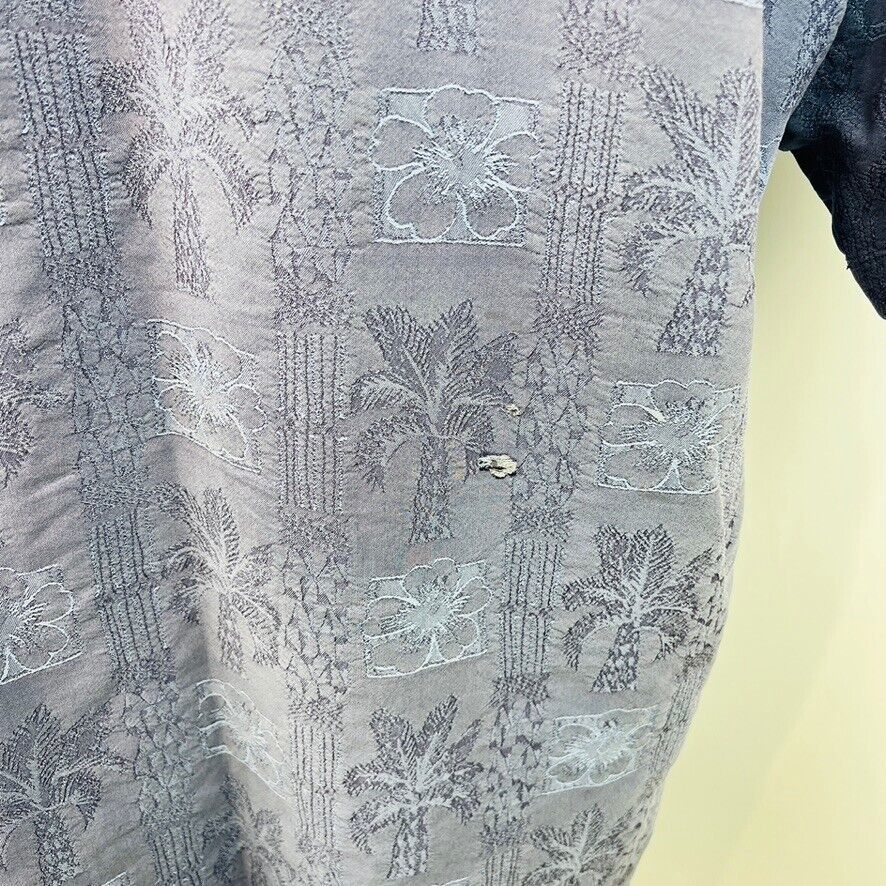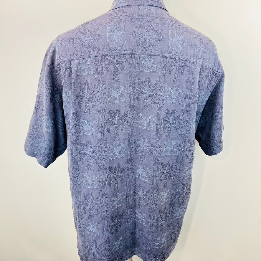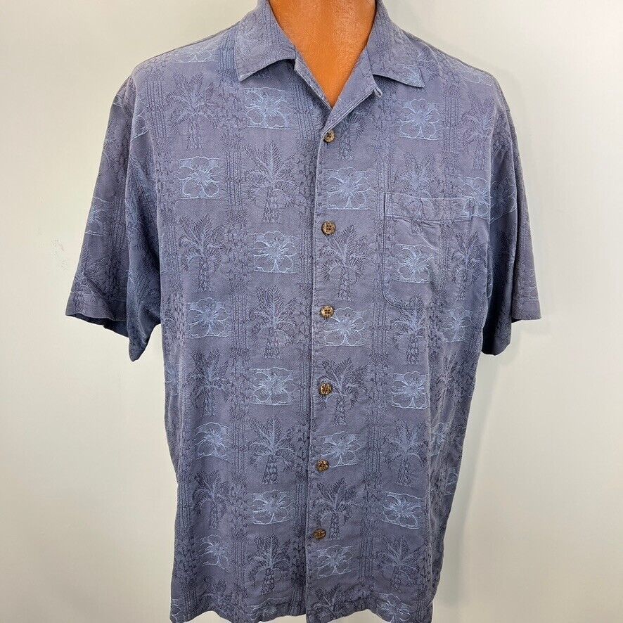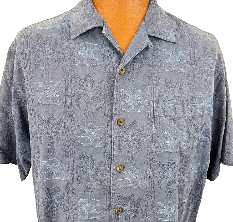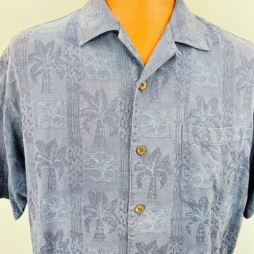 Vtg Tommy Bahama Hawaiian Aloha M Shirt Palm Trees Hibiscus Flowers Geometric Blue Shadow Print
