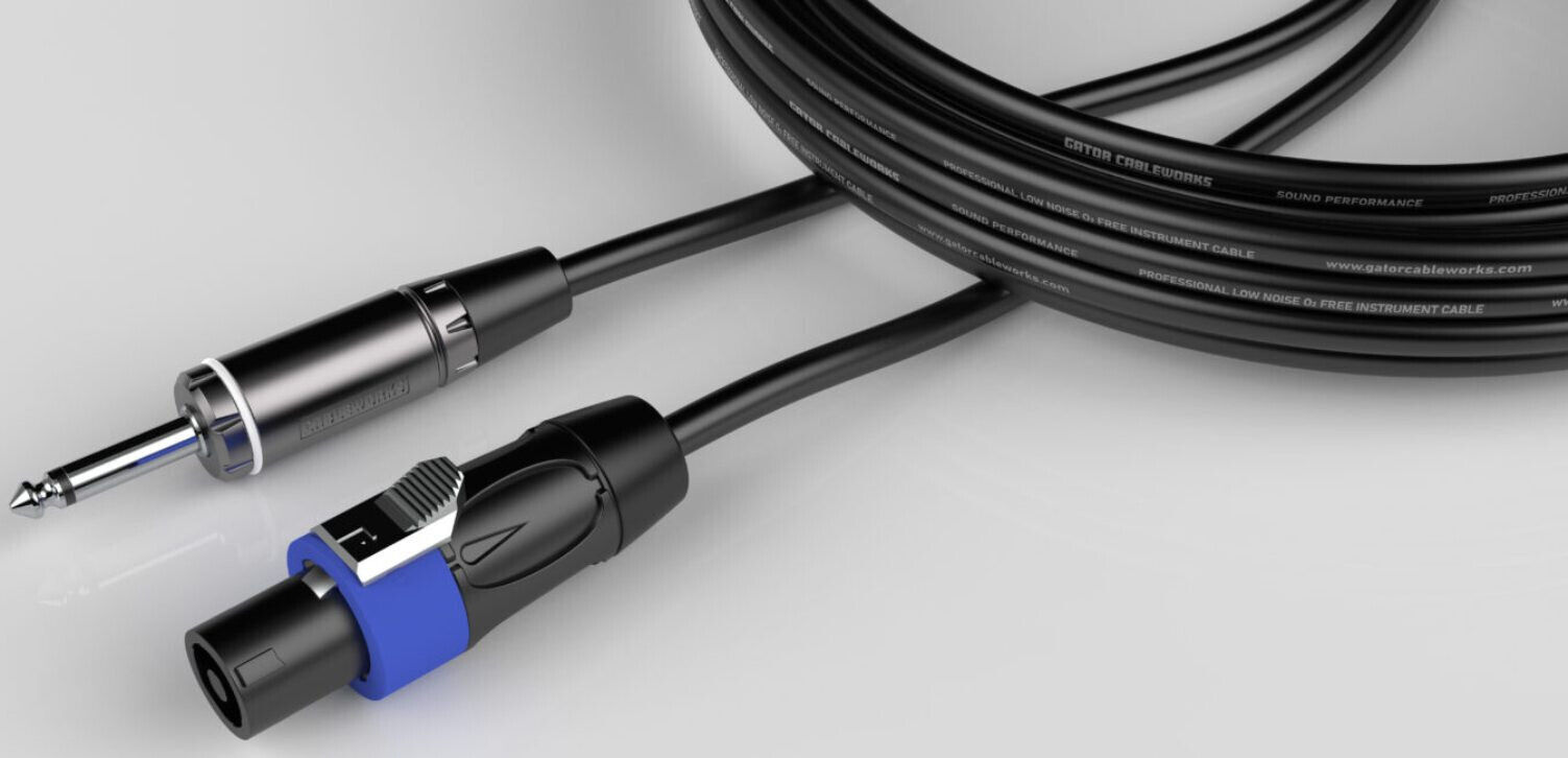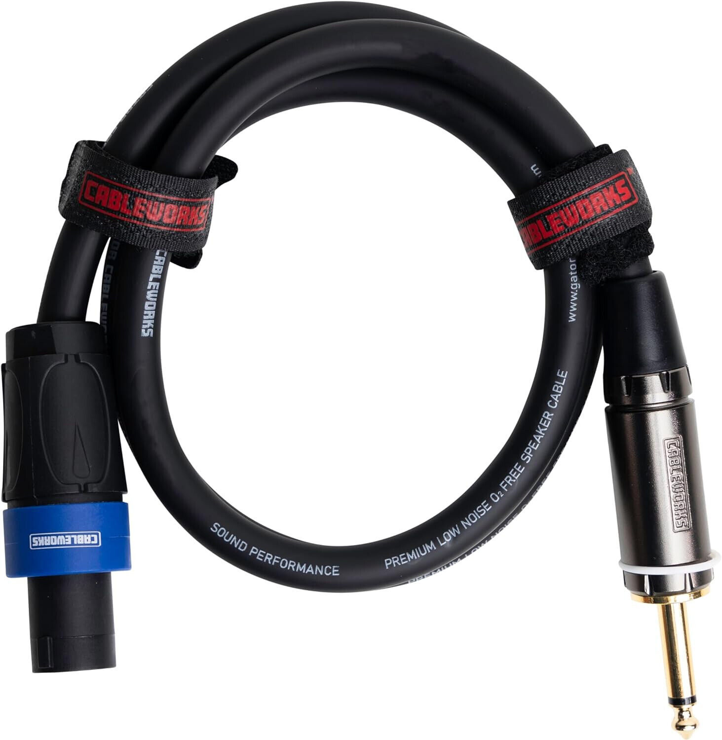 Gator Cableworks GCWC-SPK-100-1TL Composer Series 100 Foot TS to Twist Lock Connector Speaker Cable; Low Capacitance Allows More Signal Flow and Avoids Frequency Roll-Off: Fine Stranded 99.99% Oxygen Free Copper Conductor for High-Quality Signal Transmission; Brass, Nickel Plated Plug; TORIColor ID Rings for Easy Identification When Using Multiple Cables: Chuck-Style Strain Relief Cable Clamp for Secure Wire Connections; Storage Bag Included for Organization