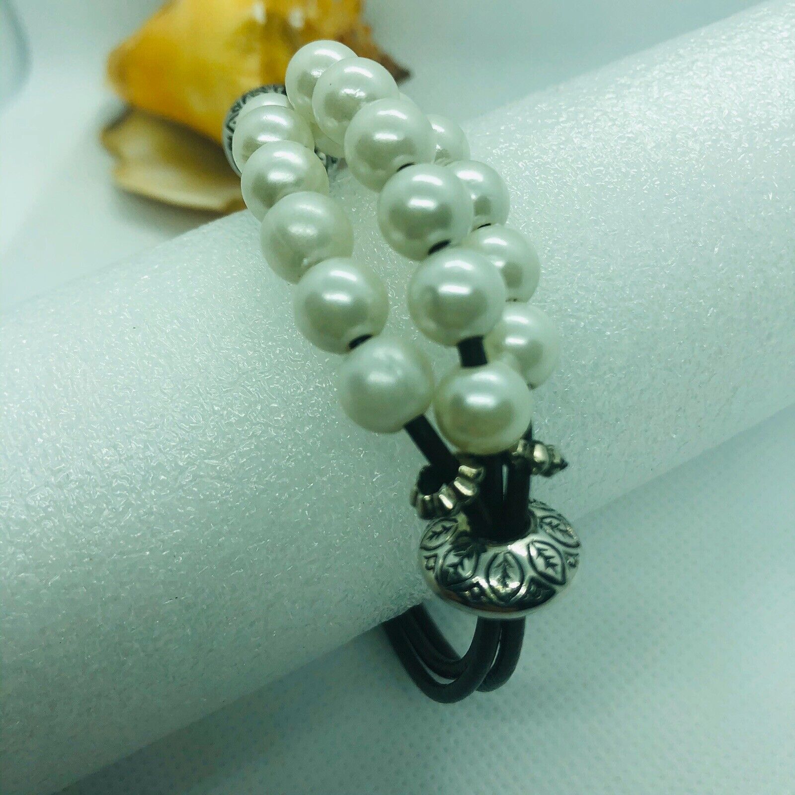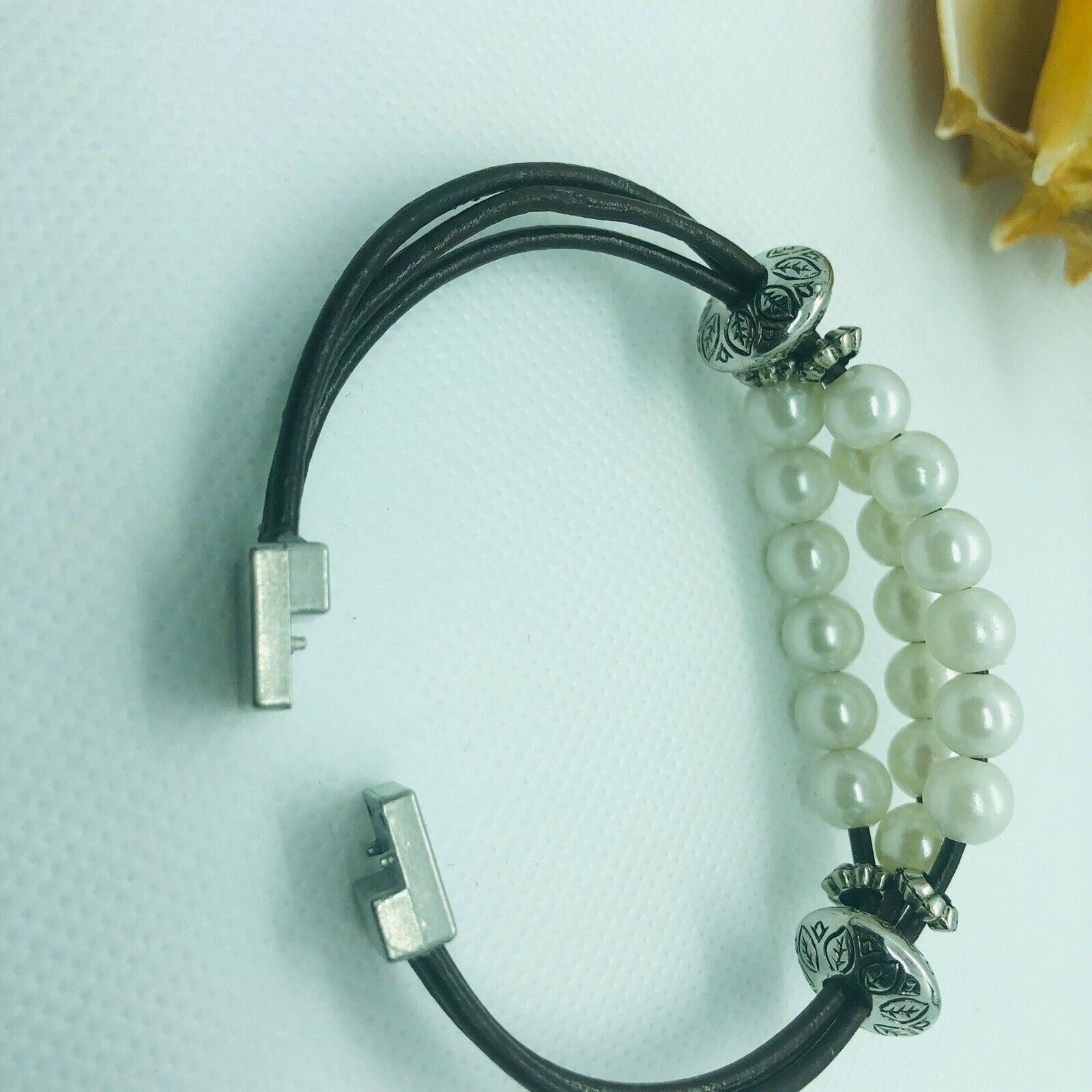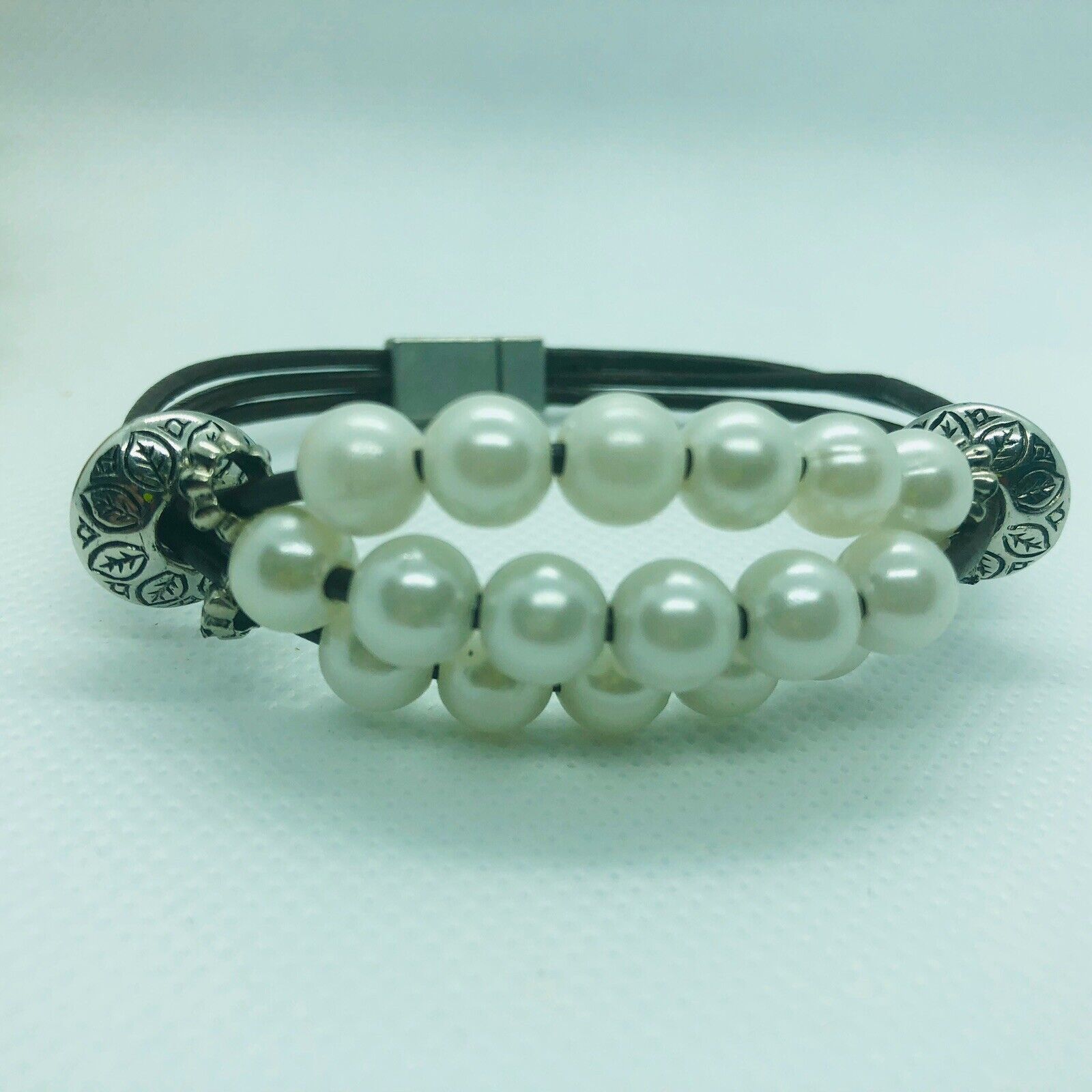 Pearls On Leather Bracelet White Faux Pearls Brown Leather Handmade Magnetic Clasp