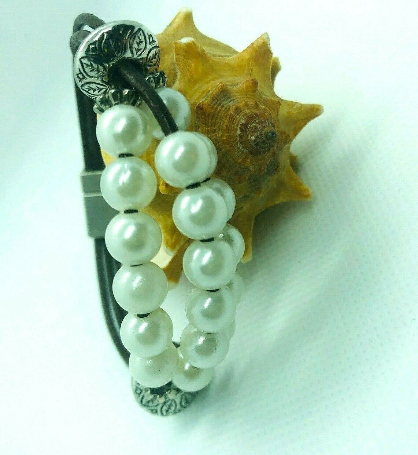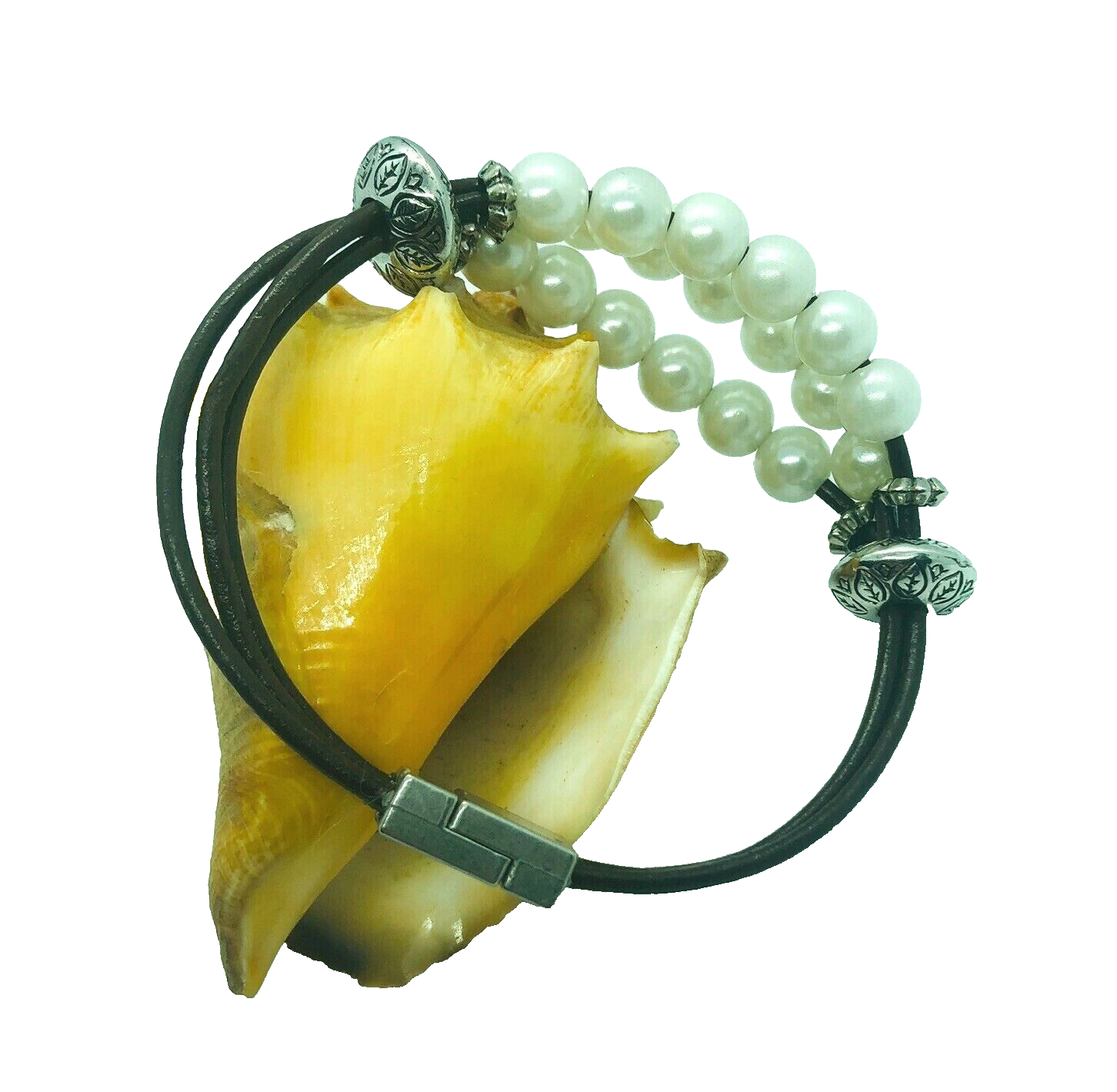 Pearls On Leather Bracelet White Faux Pearls Brown Leather Handmade Magnetic