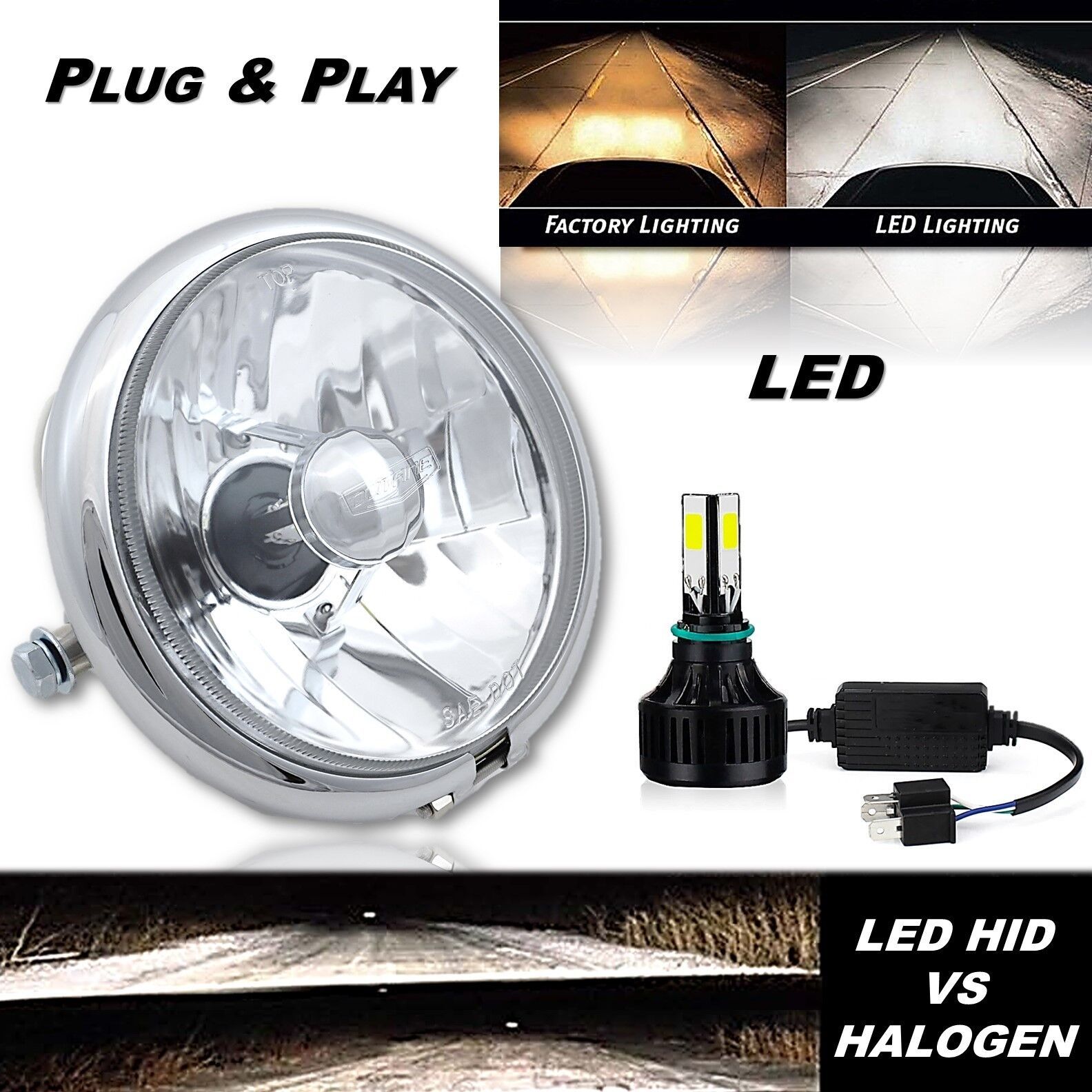 This listing is for one new 5.75" round 6 volt high/low beam crystal clear H4 conversion 3rd Generation LED motorcycle headlight with a chrome headlight bucket. Includes one 3rd Gen LED Xenon 6500k super white LED bulb. This is a glass faced headlight. These are very good quality and very bright! These headlights have a domed clear glass face unlike all all the others on the market that have a flat plastic face. These light up much brighter and whiter than the standard stock style incandescent headlight bulbs. These have the original 3 prong plug design on the back so they will plug right into the original wiring harness (no wiring modification needed). These will fit motorcycles that have 5.75 inch in diameter headlight buckets with stud mounts. Bucket is metal with a chrome finish and a bottom stud mount. We will take extra care in packaging.