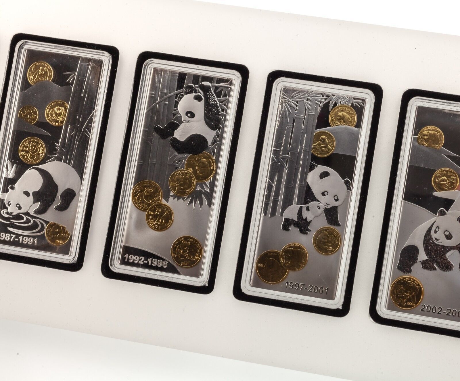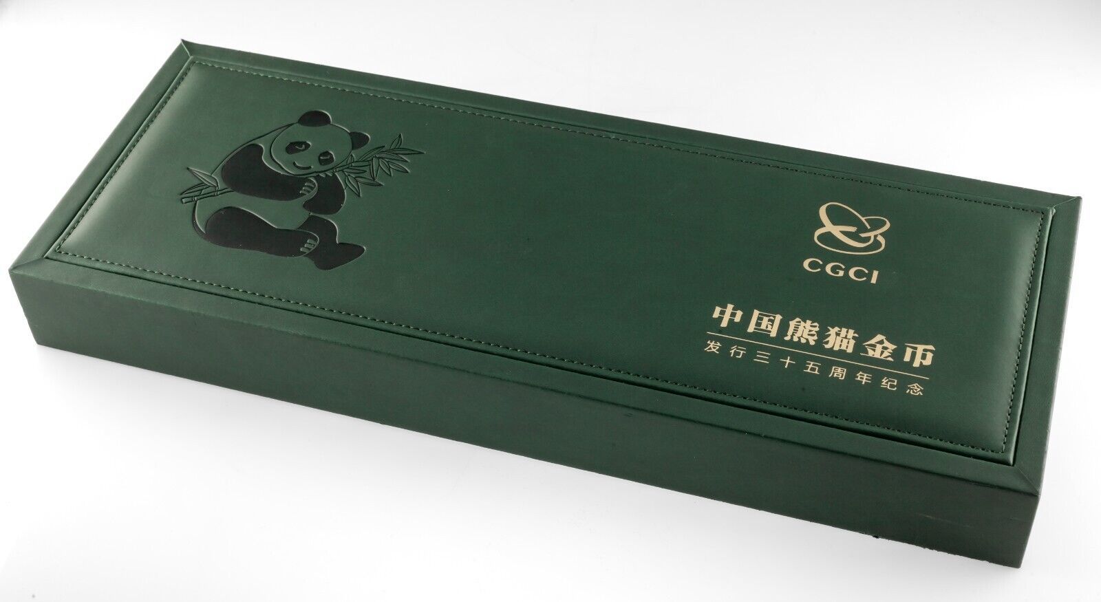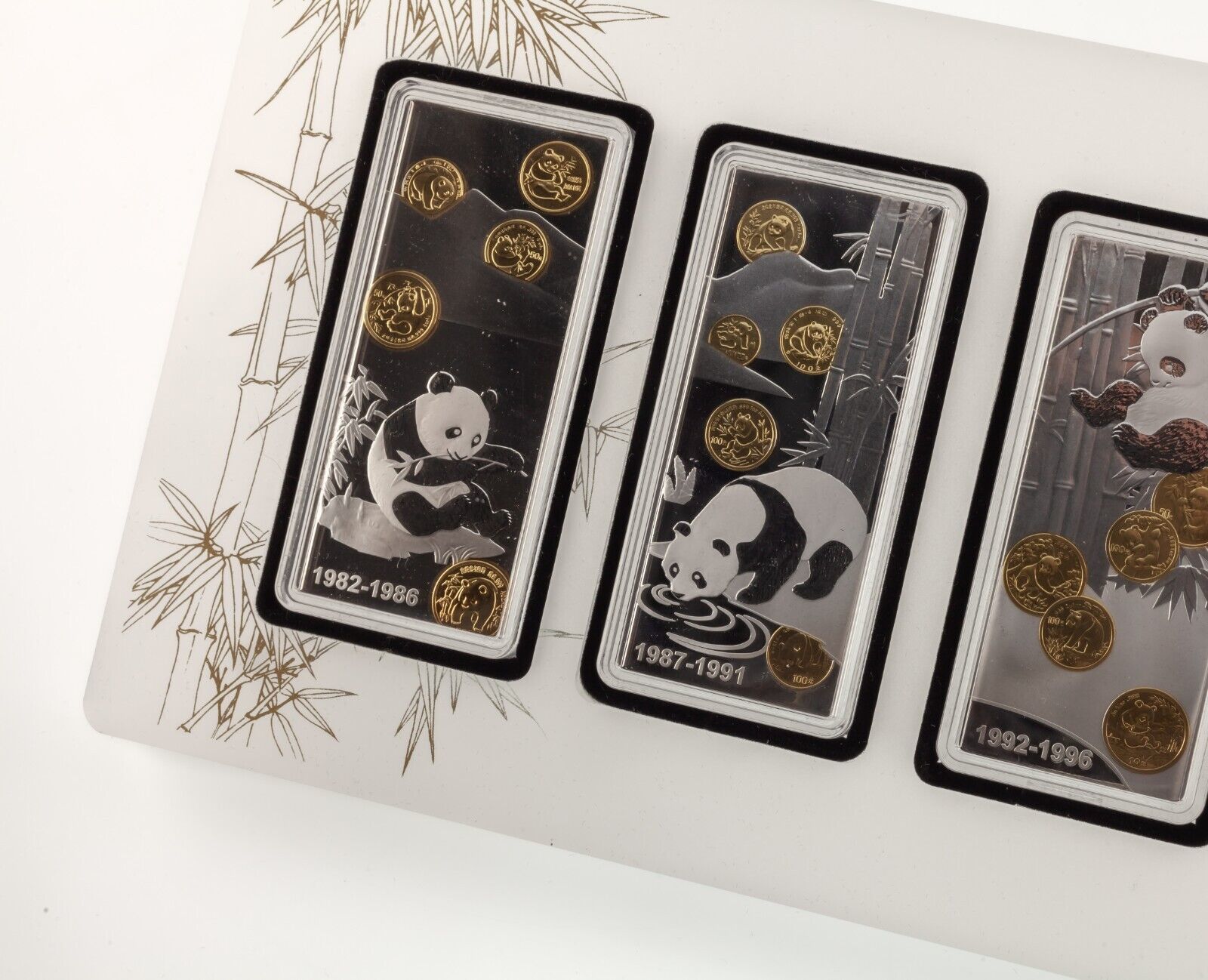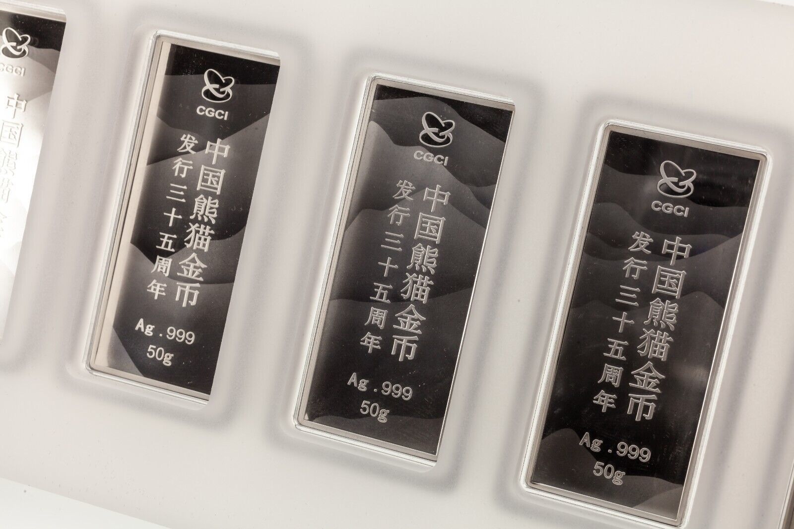 The Commemorative Silver Bars for the 35th Anniversary of the Issuance of Chinese Panda Gold Coin are issued by the China Gold Coin Incorporation, minted by Shenyang Mint Co., Ltd. and solely distributed by Shanghai Gold Coin Investment Co., Ltd. The obverse depicts the pandas frolicking in the bamboo forests, decorated with patterns of the issued Chinese Panda Gold Coins (the selective gold-plating), and marks the corresponding year versions on the lower part. The reverse depicts the logo of the China Gold Coin Incorporation and the words "The 35th Anniversary of the Issuance of Chinese Panda Gold Coin" in Chinese, fineness and the weight. The 7 bars can piece together a complete pattern. This is to certify that the bars are standard as to their fineness and weight.