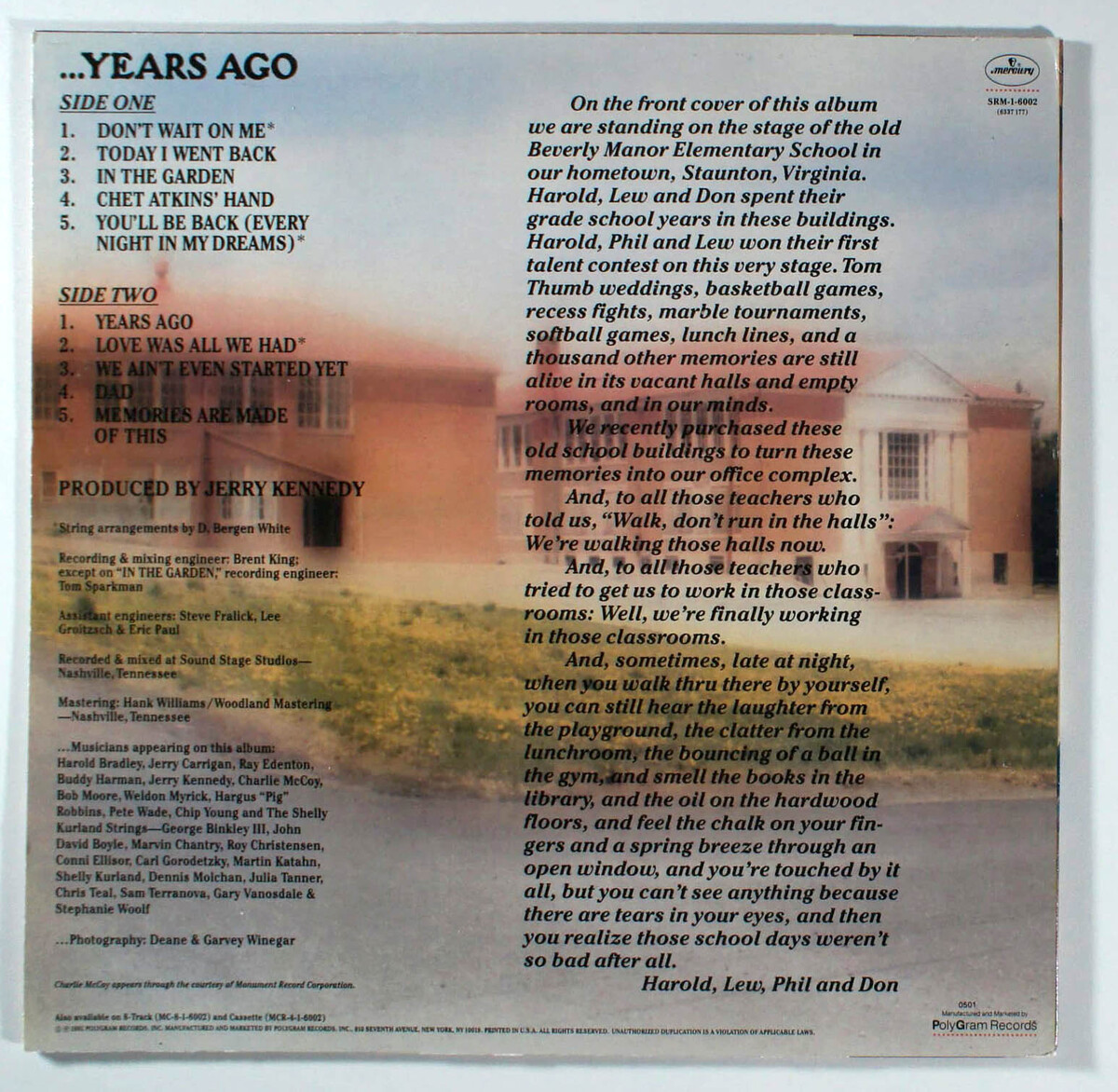 Years Ago, by The Statler Brothers peaked at No. 9 on the Billboard Top Country Albums chart. Prior to recording Years Ago, the Statlers purchased their old grammar school in their hometown of Staunton, Virginia, renovating the building to serve as their offices. (On the album cover, the group is photographed on the auditorium's stage.) Perhaps as a result, the record quite nostalgic and sentimental, as evidenced by the song titles alone, including Memories Are Made of This and Today I Went Back. Among the record's hits were Don't Wait on Me and You'll Be Back (Every Night in My Dreams).