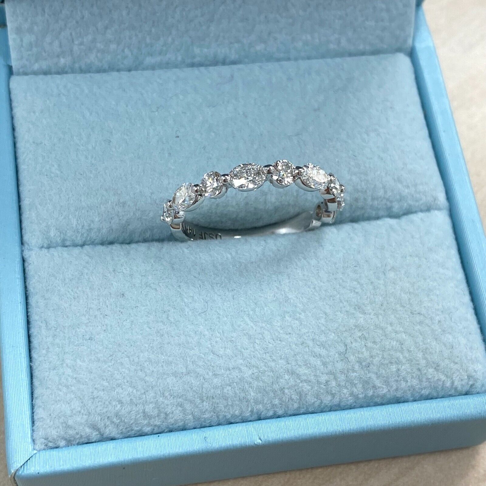 Introducing our exquisite wedding band, a true symbol of elegance and romance. This stunning piece showcases a unique alternating design, adorned with round and oval-shaped lab-grown diamonds. Crafted with precision in 14k white gold or yellow gold, it radiates timeless beauty and modern charm.