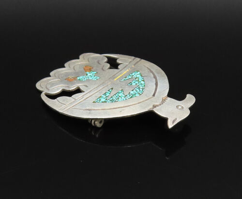 SOUTHWESTERN 925 Silver - Vintage Turquoise & Coral Bird Brooch Pin - BP9821