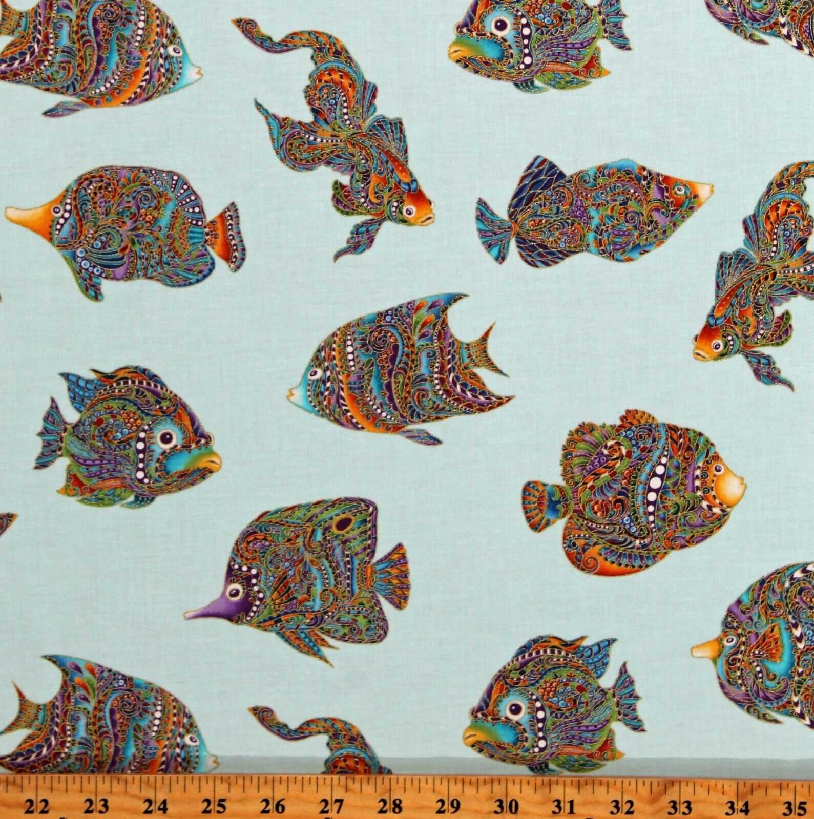 Cotton Fishes Ocean Animals Colorful Multi-Color Metallic Paisley Decorative Hooked on Fish Something Fishy Light Turquoise Cotton Fabric Print by the Yard (13003M-80)