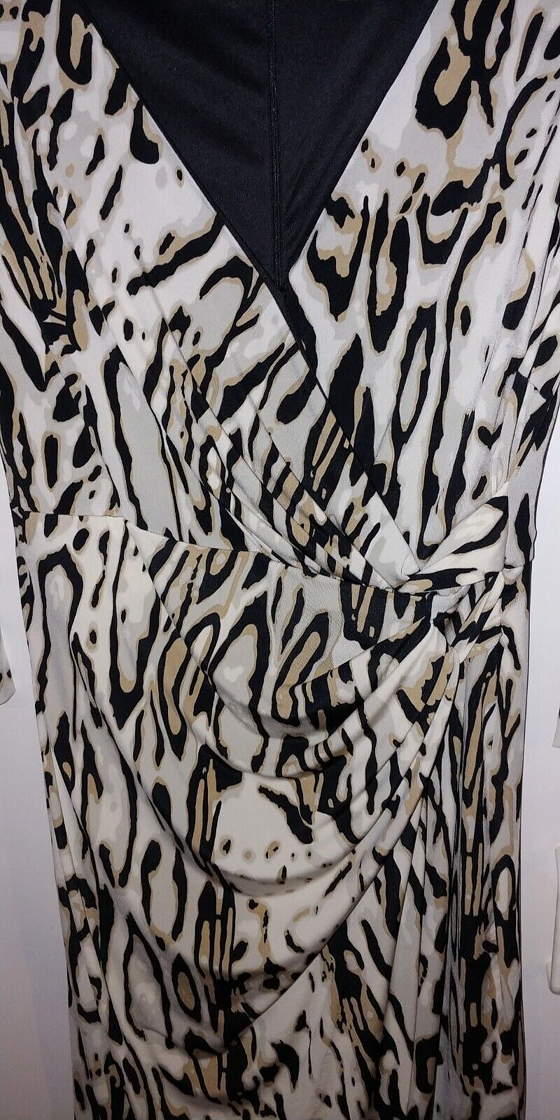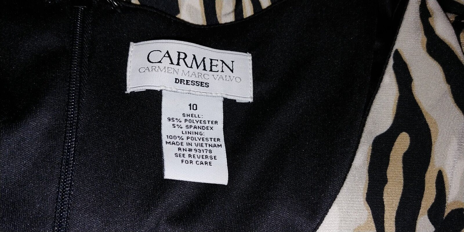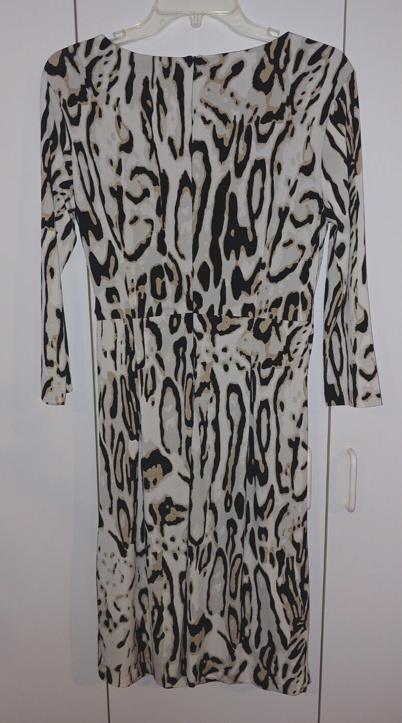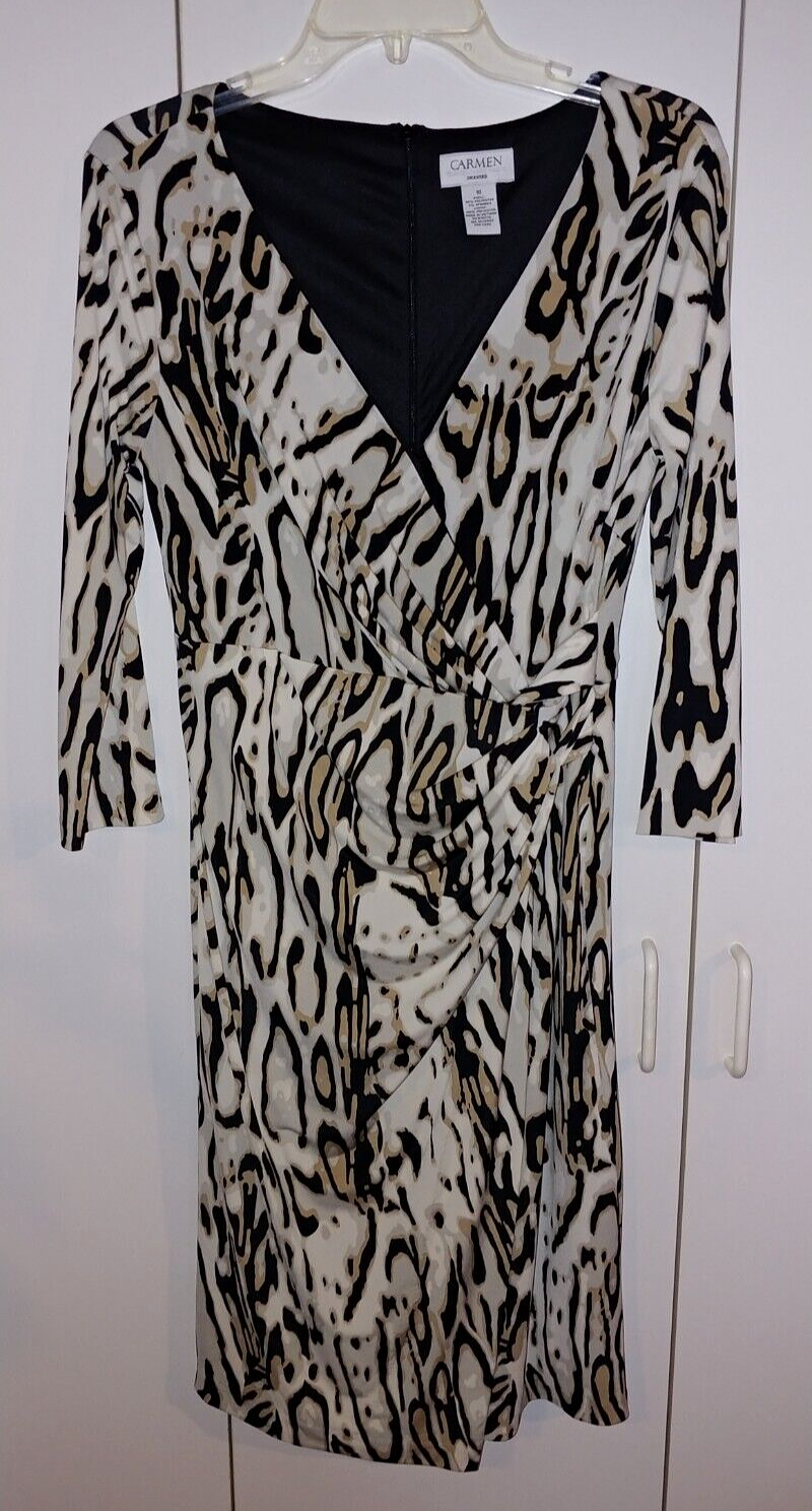 THIS IS A LOVELY LADIES CARMEN MARC VALVO 3/4-SLEEVE KNIT POLYESTER/SPANDEX CROSS-OVER V-NECK DRESS IN A SIZE 10. IT IS IN EXCELLENT, BARELY WORN, IF AT ALL, CONDITION.