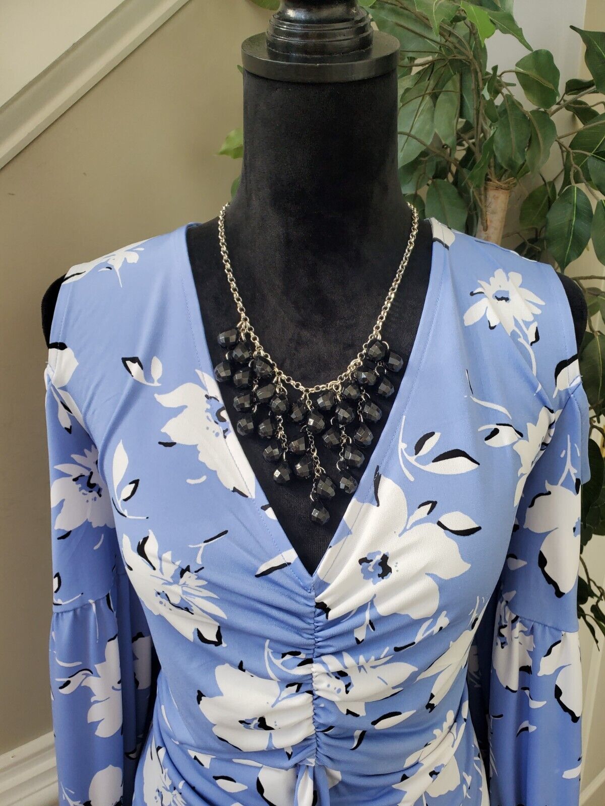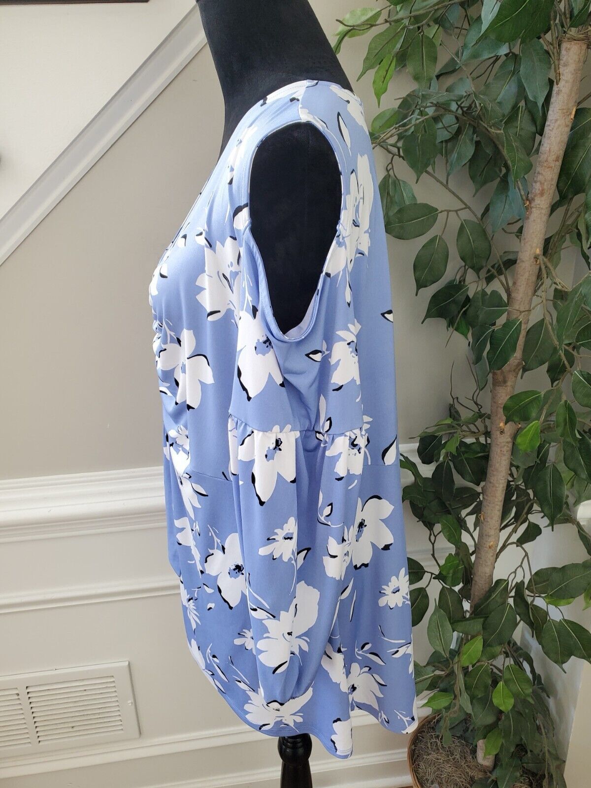 Cato Womens Blue Floral Polyester Ruched Cold Shoulder V Neck Top Blouse Size XL
