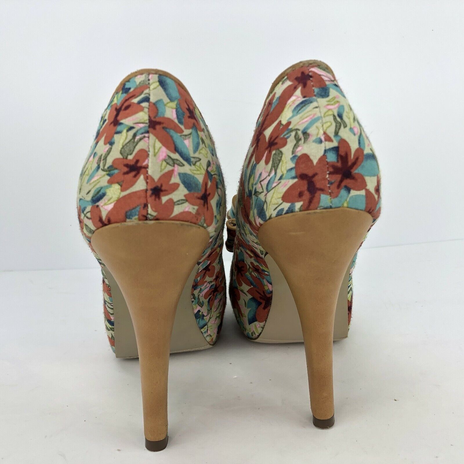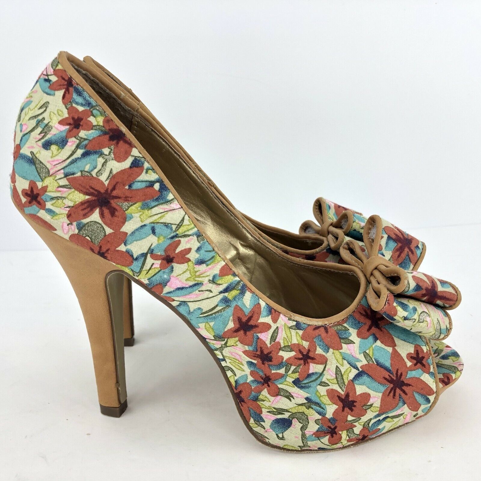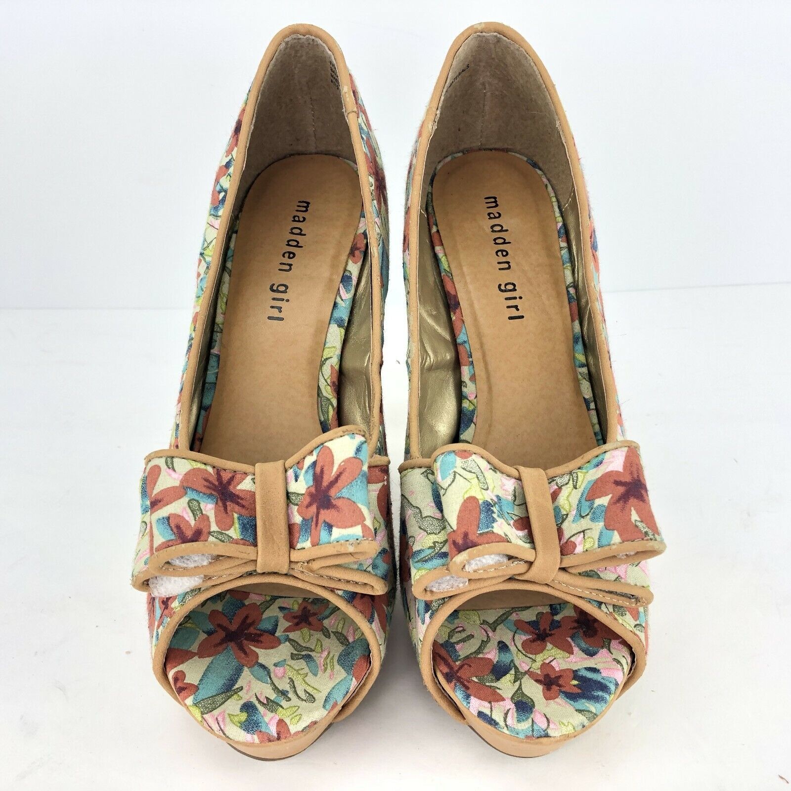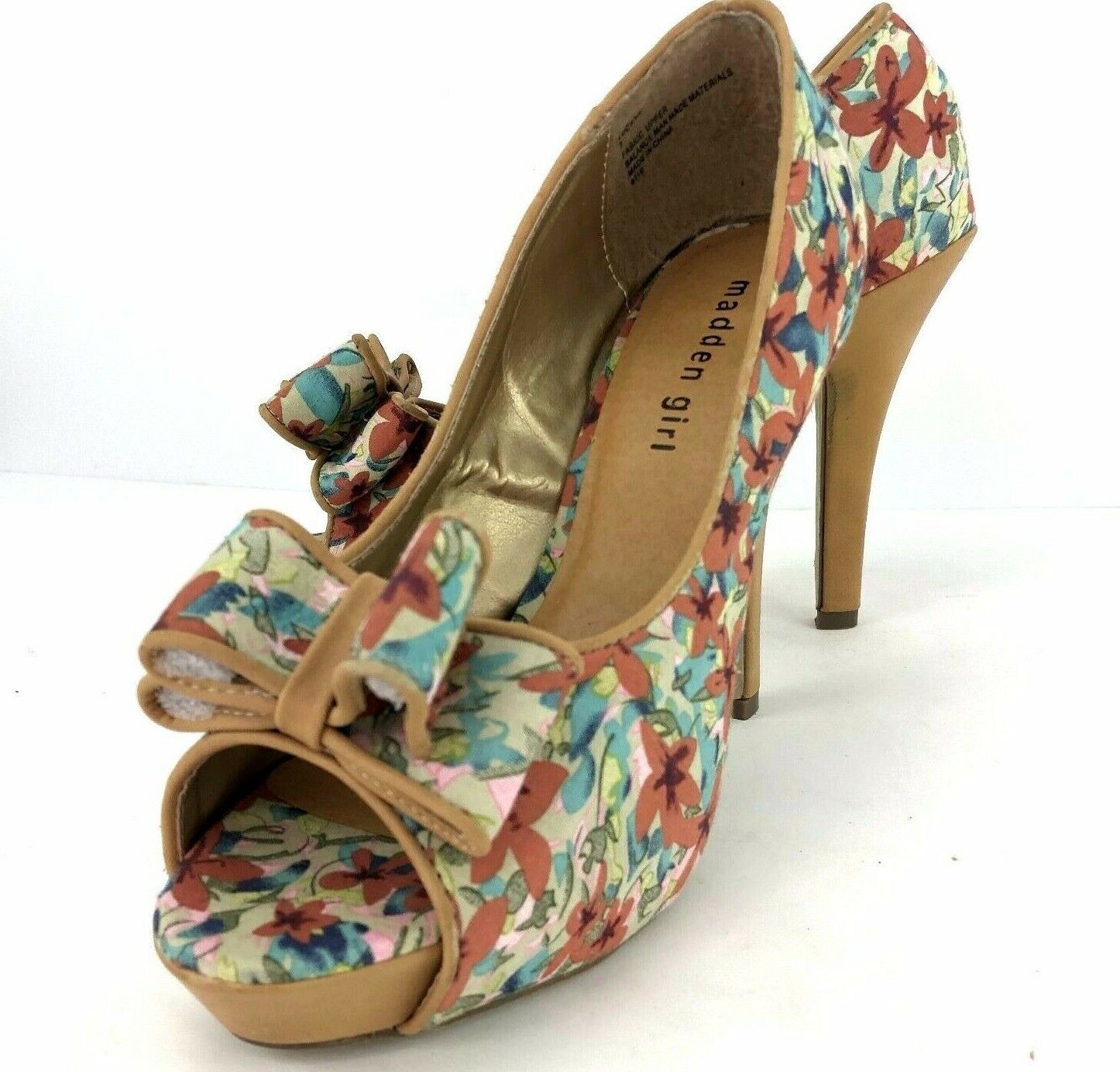 Madden Girl Lukkie Size 7 Floral Open Toe Pump Bow Orange Blue Tan Slip On