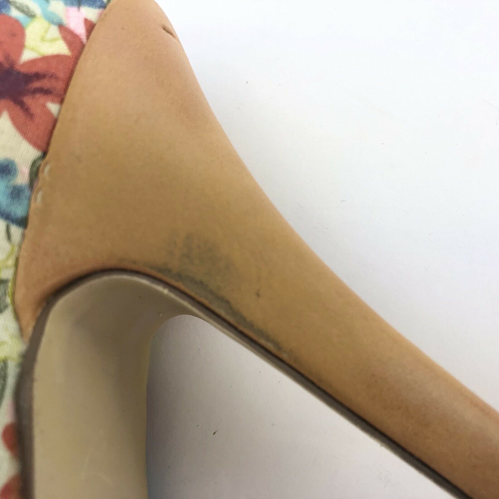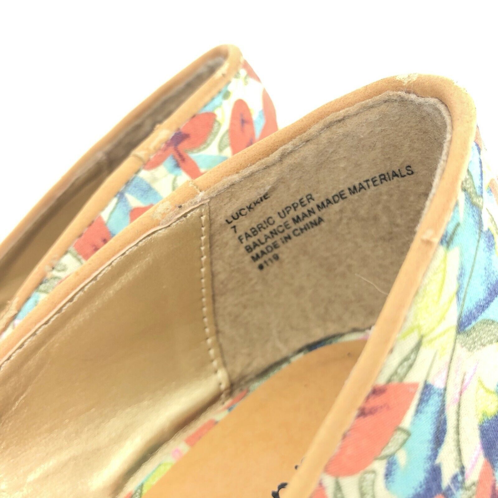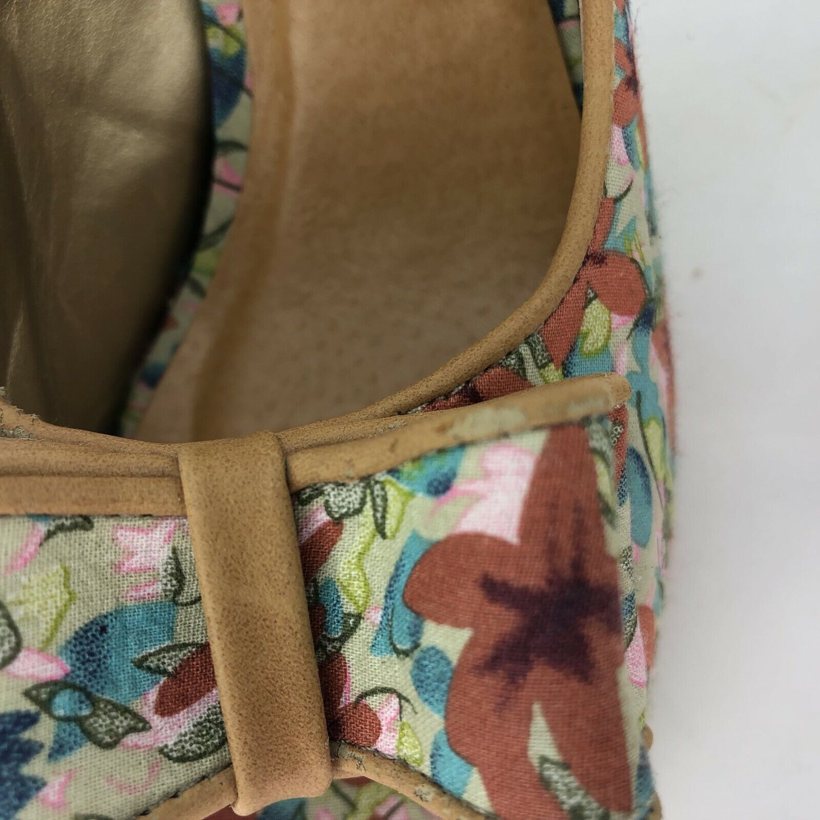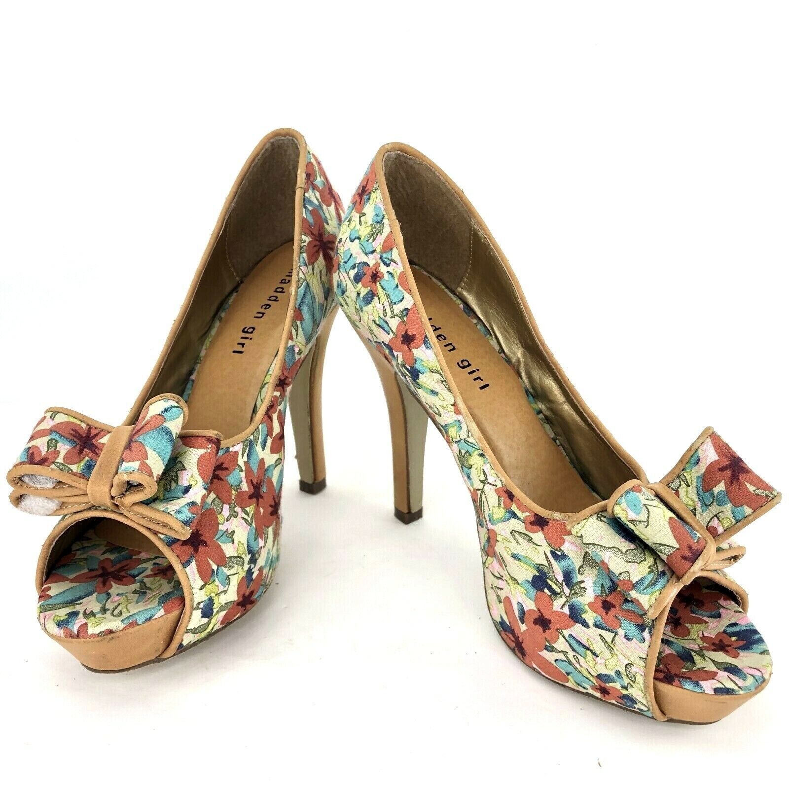 Madden Girl Lukkie Size 7 Floral Open Toe Pump Bow Orange Blue Tan Slip On