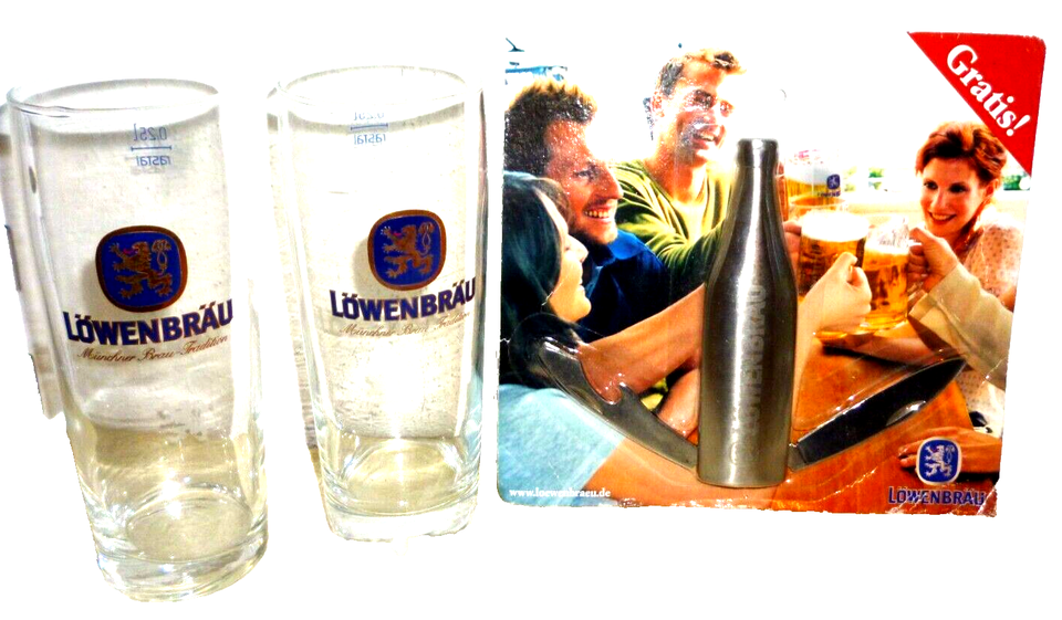 For sale is a wonderfull Set-of-6 (SIX) Lowenbrau beerglasses 1 promotion-only, still-sealed Lowenbrau Bottle Opener Munich, Germany.