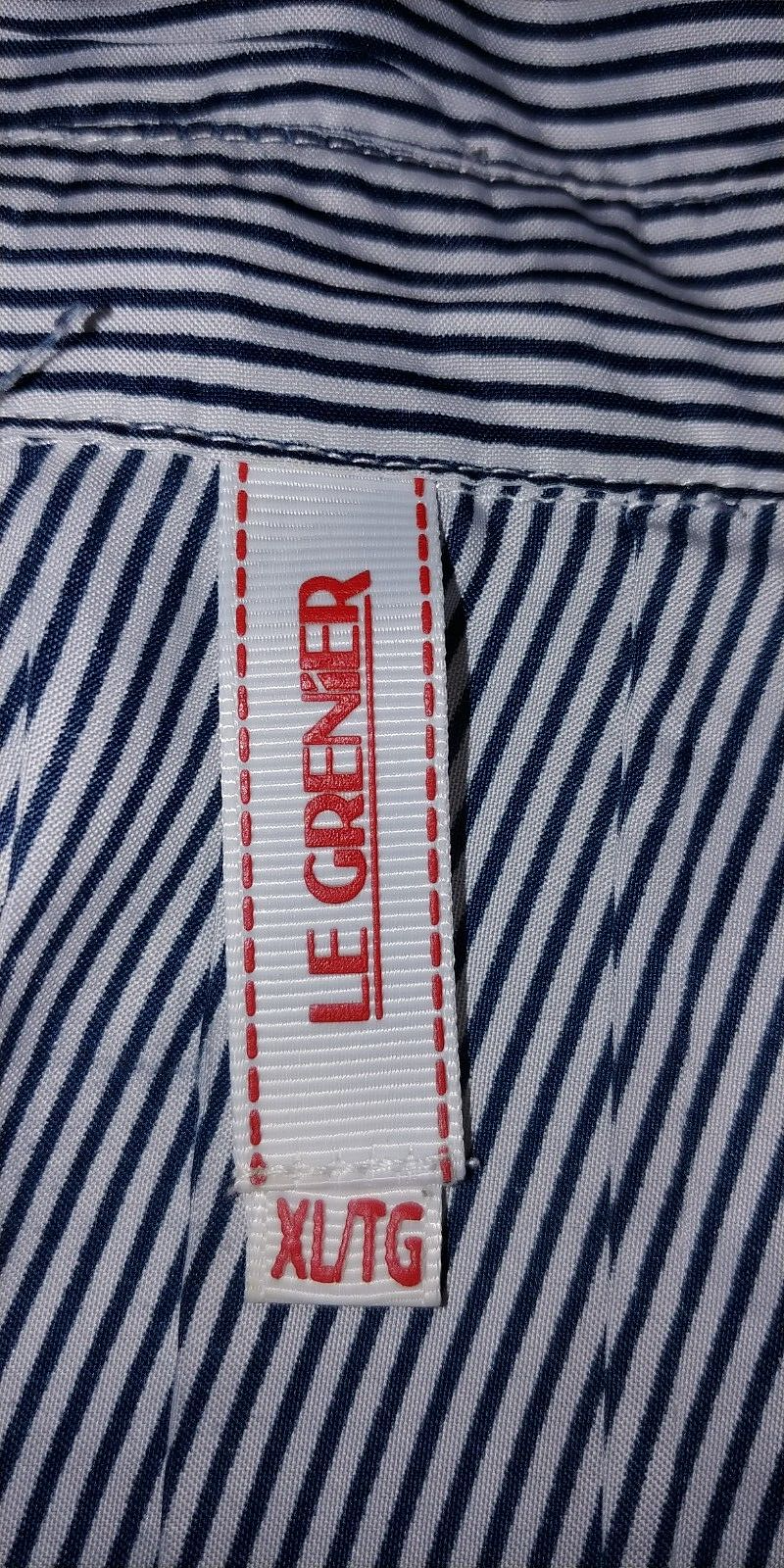 THIS IS A GREAT LADIES LE GRENIER SHORT ROLL/TAB BUTTON PINSTRIPE THIN TOP IN A SIZE XL. IT IS IN EXCELLENT, BARELY WORN, CONDITION. I FIND NO CONTENT/CARE TAG; IT IS A NICE THIN, SOFT WOVEN CRINKLE FABRIC.