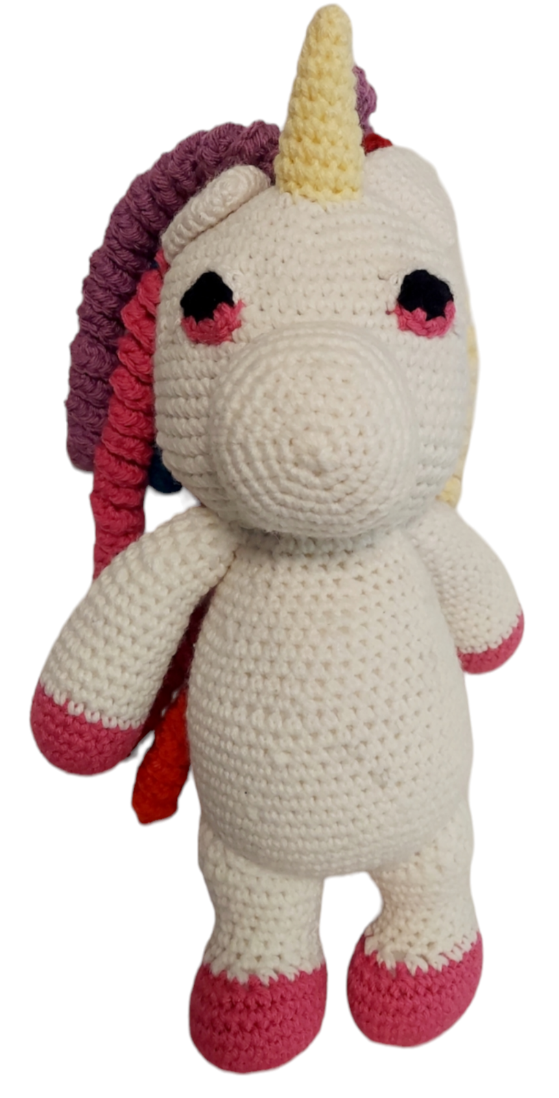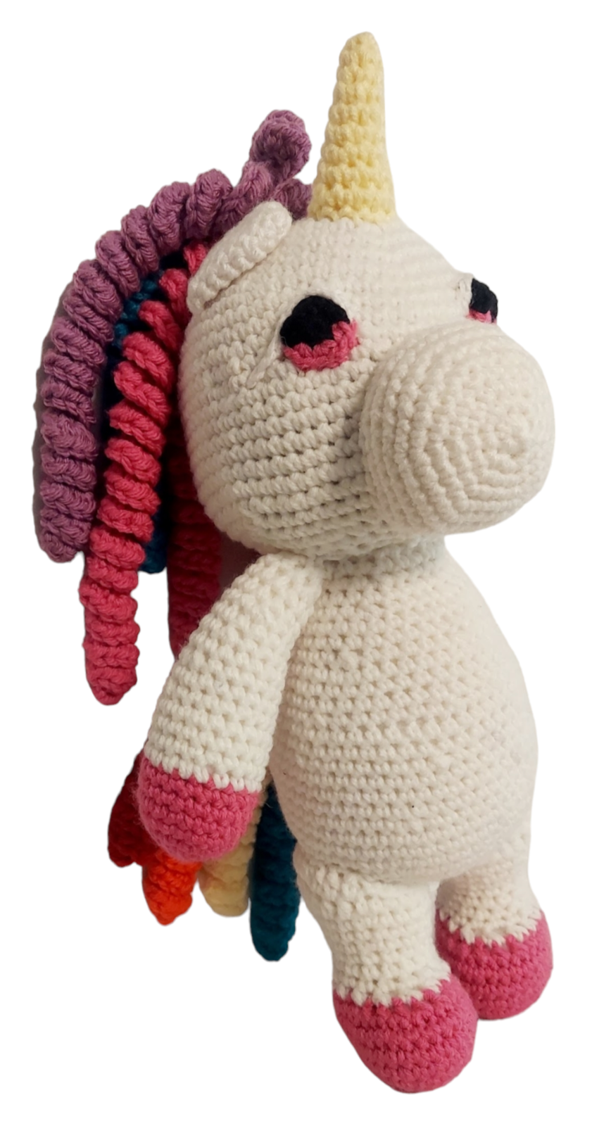 This Rainbow Unicorn has a rainbow hair and mane. It is made with acrylic yarn for durability. It is safe for children of all ages as all the parts are sewn on securely.
